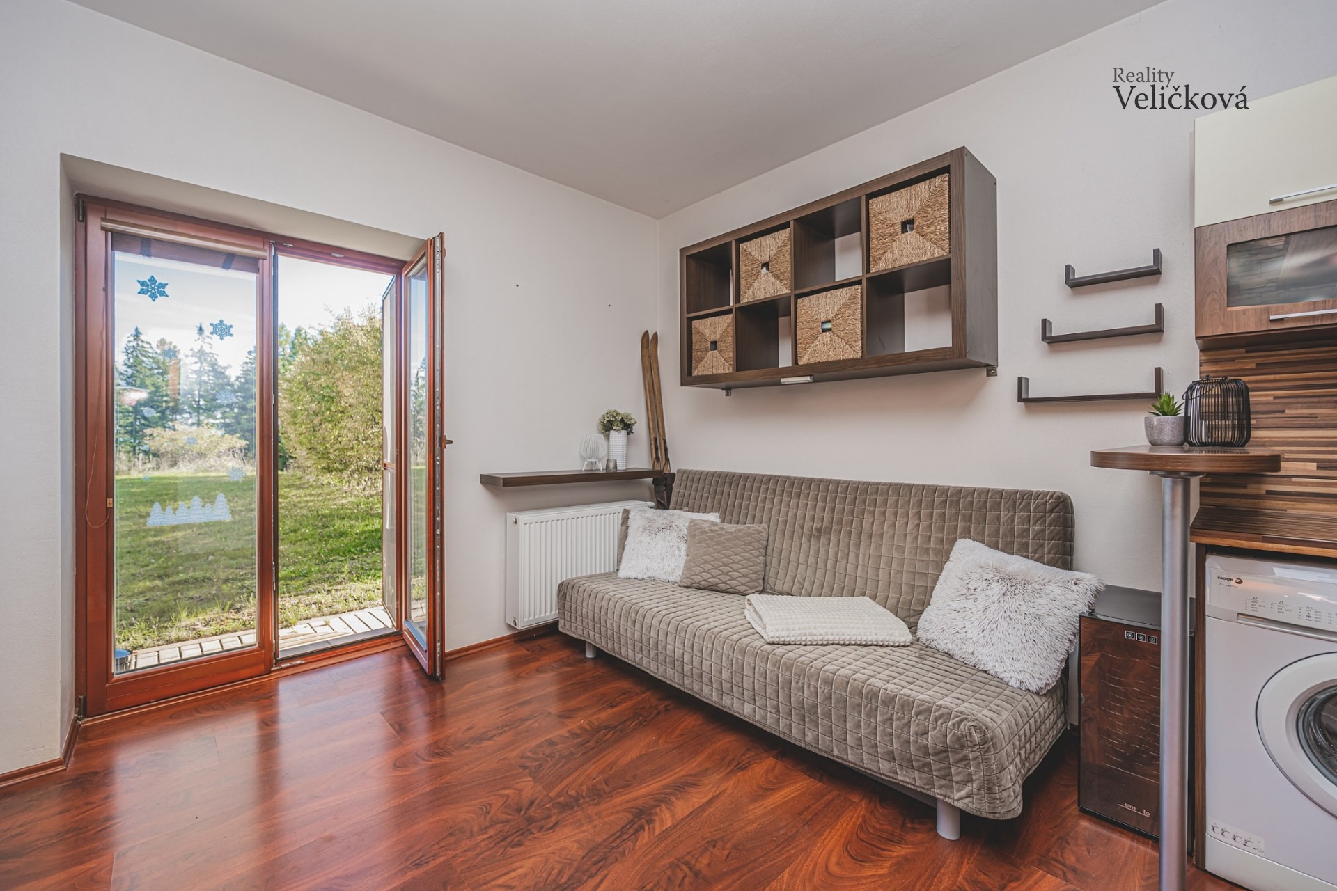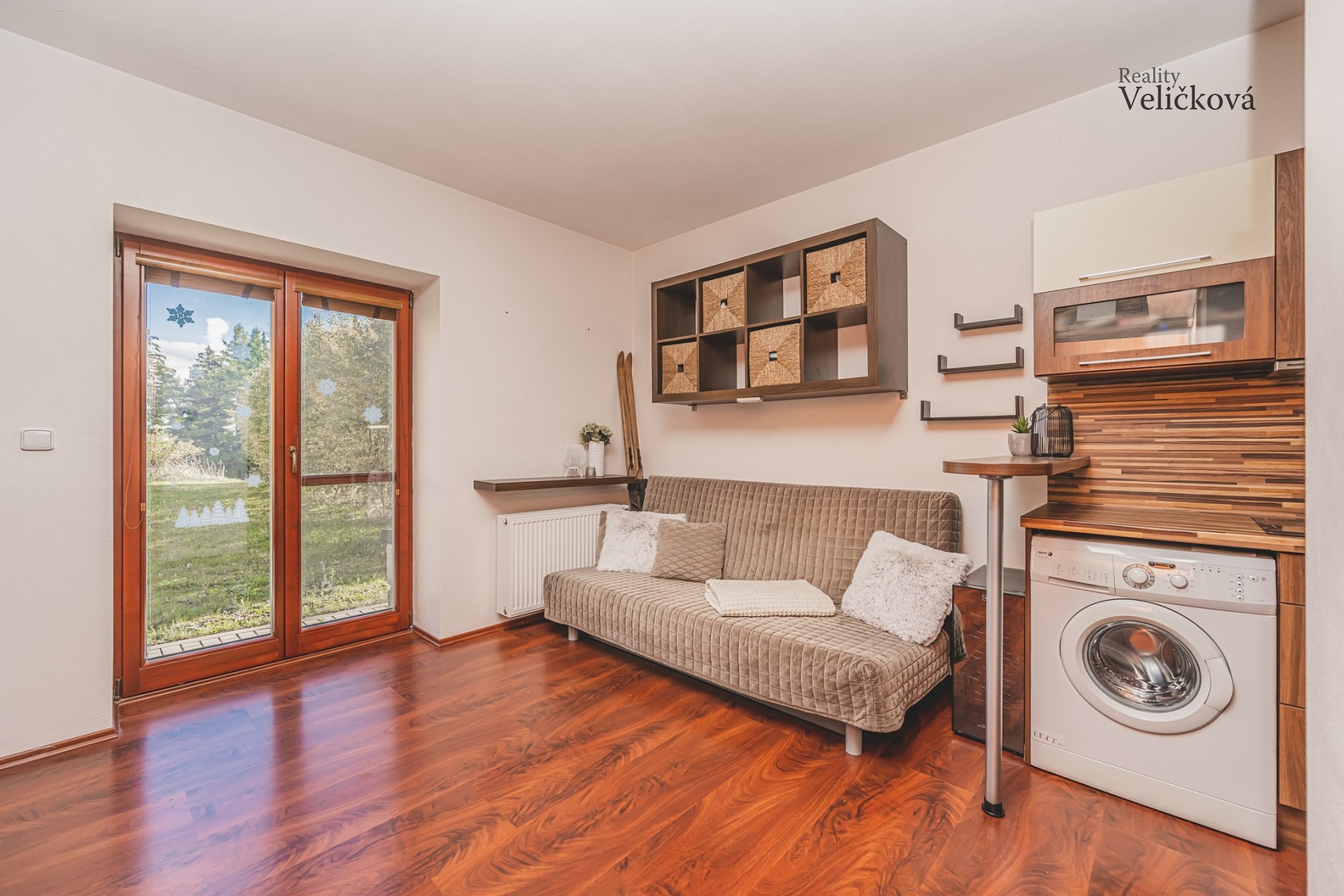 Dispozice: vstupní chodba s vestavěnou skříní, koupelna s WC a sprchovým koutem, kuchyňský kout vč. vestavěných spotřebičů (indukční varná deska, pračka, trouba, myčka, digestoř, lednice), menší obytná část s rozkládací sedací soupravou a policemi, spací část - spací patro, pod nímž je knihovna a menší sedací souprava, psací stůl s židlí, vstup na předzahrádku. V přízemí se nachází sklepní kóje, která má důmyslně vyřešené držáky na lyže a snowboardy.