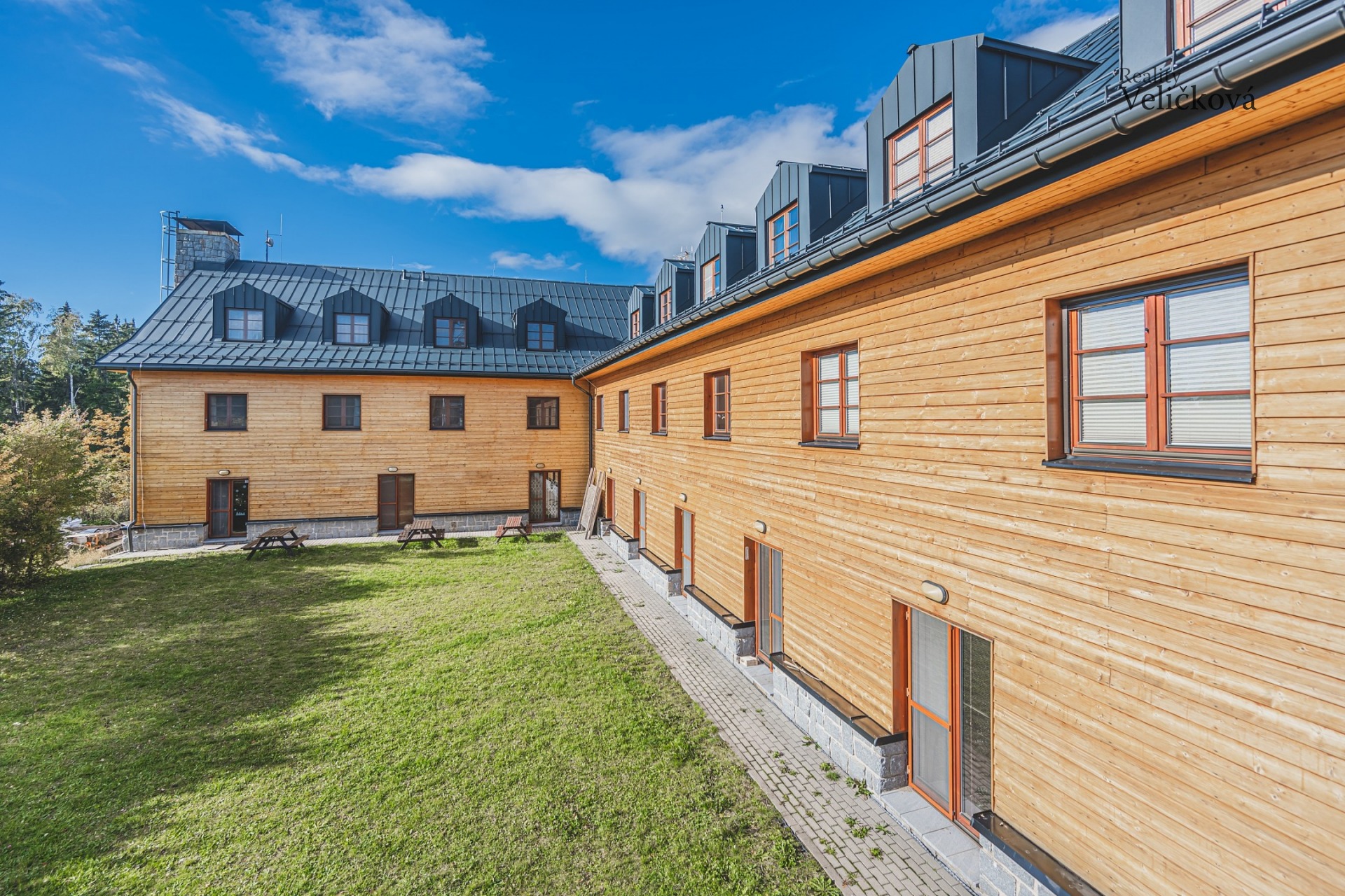 Dům je cihlový (Porotherm), celoplošně obložený dřevem, s nedávno pokládanou novou plechovou střechou v barvě antracit. Momentálně probíhají nátěry fasády a výměna septiku, z něhož odpad odchází přepadem do kanalizace. Dům byl postaven v roce 2008. Parkování před ním je možné pouze pro jednotlivé apartmány, vjezd přes závoru je ovládán čipem.