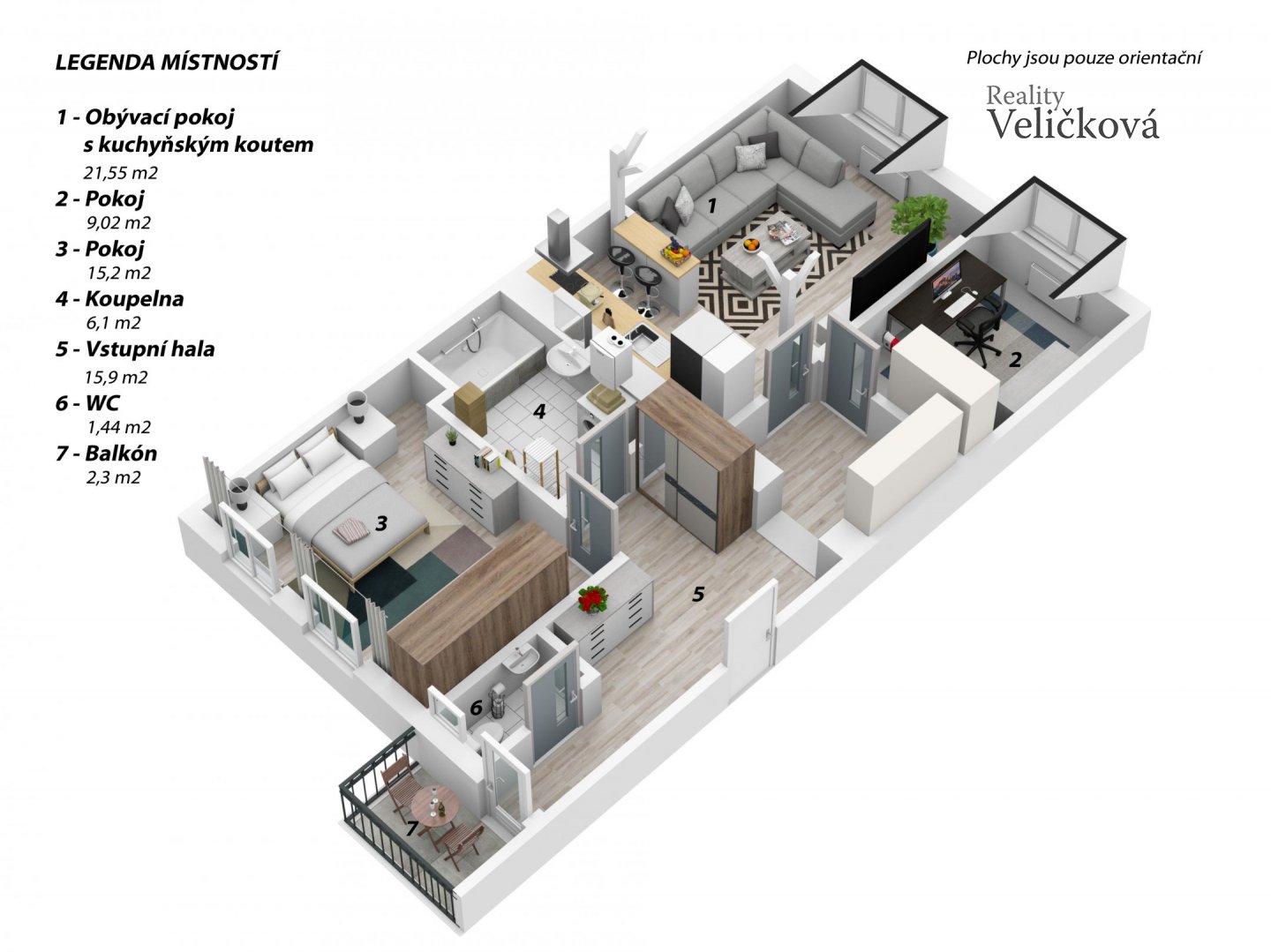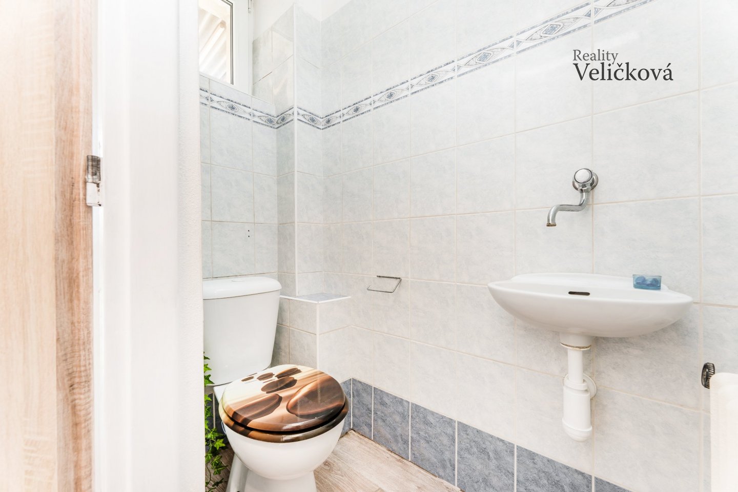 Dispozice: vstupní chodba, balkon, koupelna s vanou, WC, prostorná ložnice, dětský pokoj, kuchyň s barem oddělujícím obývací pokoj, sklep v přízemí.