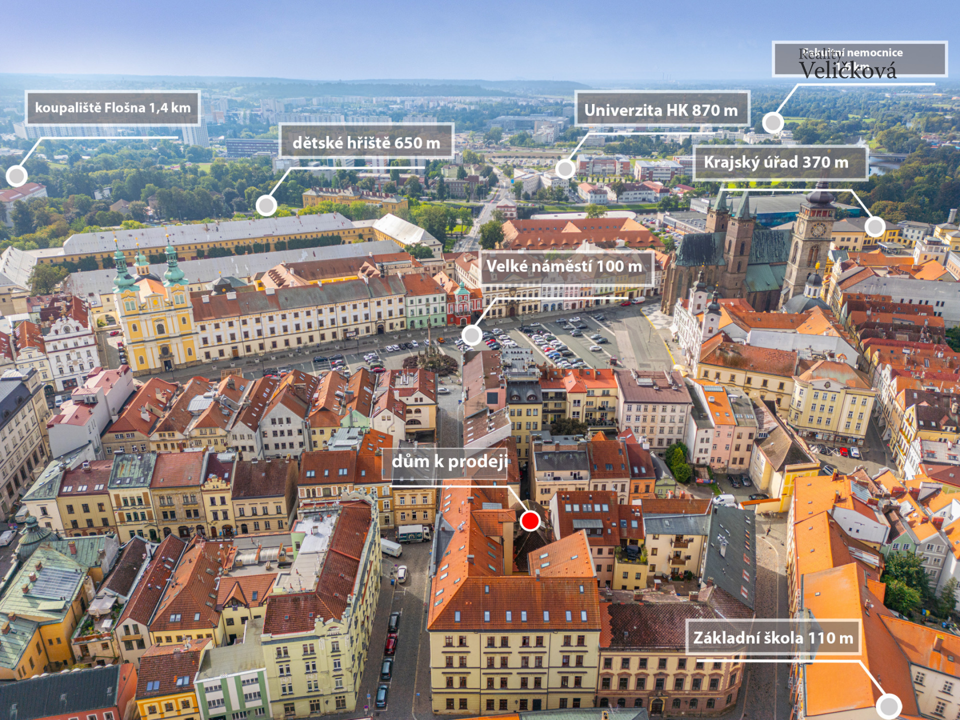 V docházkové vzdálenosti se nachází Velké náměstí, univerzitní areály, obchody, restaurace, kavárny a úřady. Historické centrum Hradce Králové patří mezi nejvyhledávanější investiční lokality, což zvyšuje hodnotu nemovitosti a její atraktivitu do budoucna. Dům disponuje menším dvorem ve vnitrobloku budov, kde je možné například umístit terasu, kolárnu či vyhrazený prostor pro komunální odpad, V případě zájmu o tuto nabídku mě neváhejte oslovit.