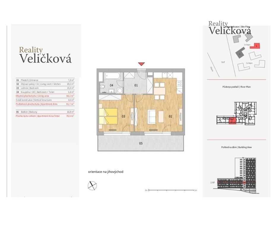Nabízíme k prodeji velmi pěkný, moderní byt 2+kk s prostorným balkonem v novostavbě v "Rezidenci Zahálka" v Modřanech na Praze 4. Nově zkolaudovaný byt o podlahové ploše 78,5 m2 se nachází ve 3. nadzemním podlaží v nově vzniklém promyšleném projektu "Rezidence Zahálka" a je okamžitě k dispozici. K bytu náleží terasa (16,8 m2), sklepní kóje (3,1 m2) a prostorné garážové stání (542 x 268 cm), které lze zakoupit i samostatně. Přístupy do garáže i budovy jsou zabezpečeny kamerovým systémem a k vjezdu i vstupu do budovy slouží čip. Ideální pro vlastní bydlení nebo jako investice na pronájem.