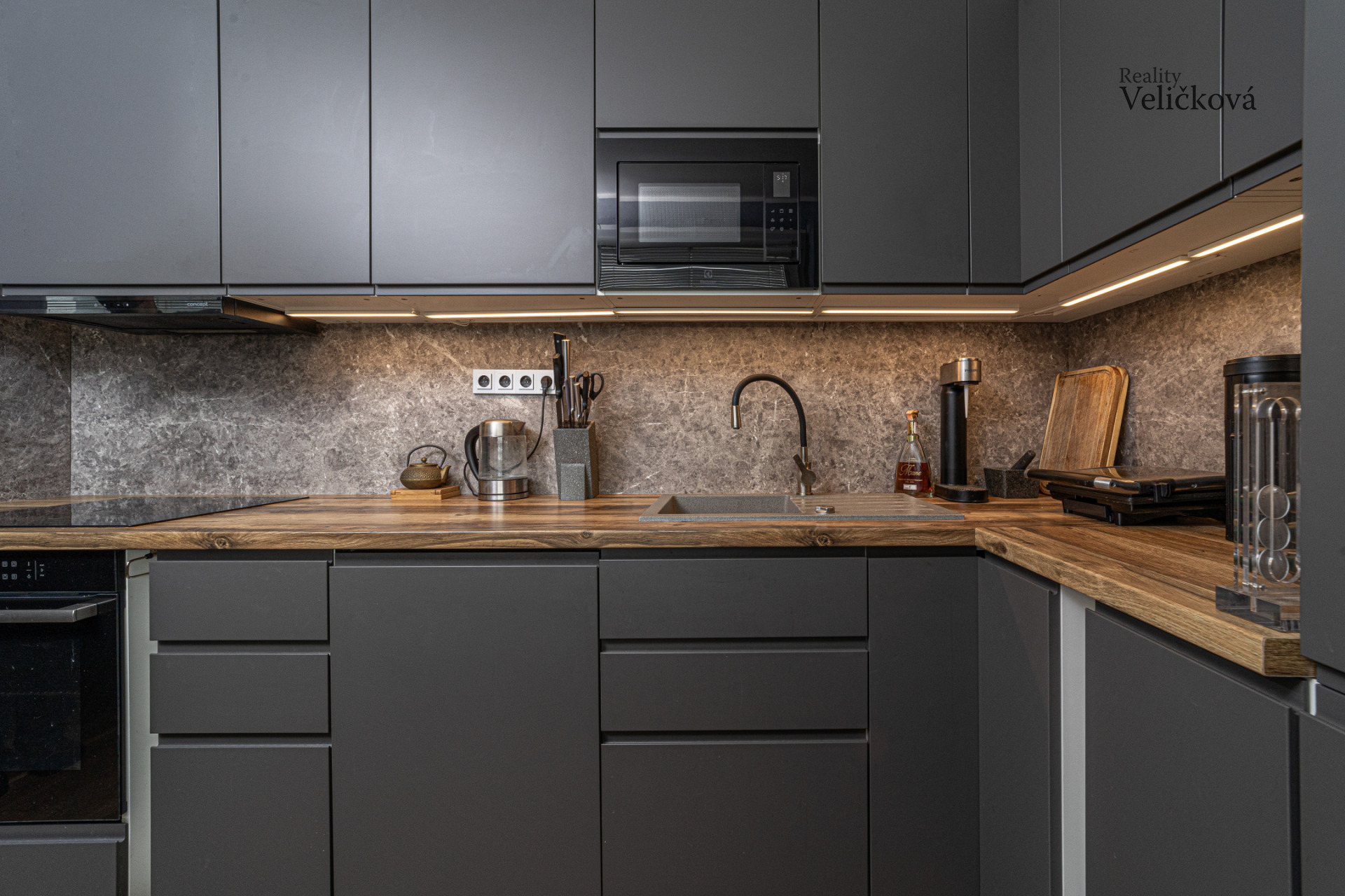 Kuchyně, která je elegantně propojená s obývacím prostorem, je vybavena spotřebiči značek Bosch, Aeg, Beko a Electrolux (elektrická trouba, indukční deska, mikrovlnná trouba, myčka šíře 60 cm, odsavač par a lednice s mrazákem).