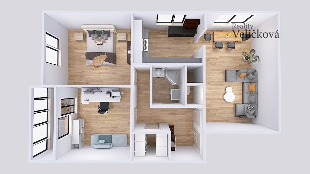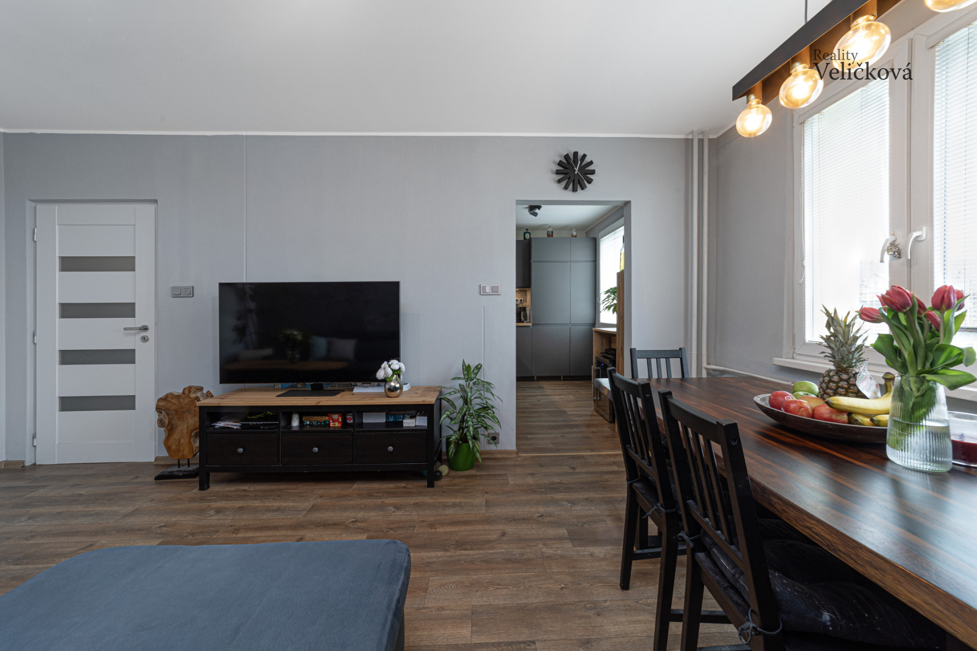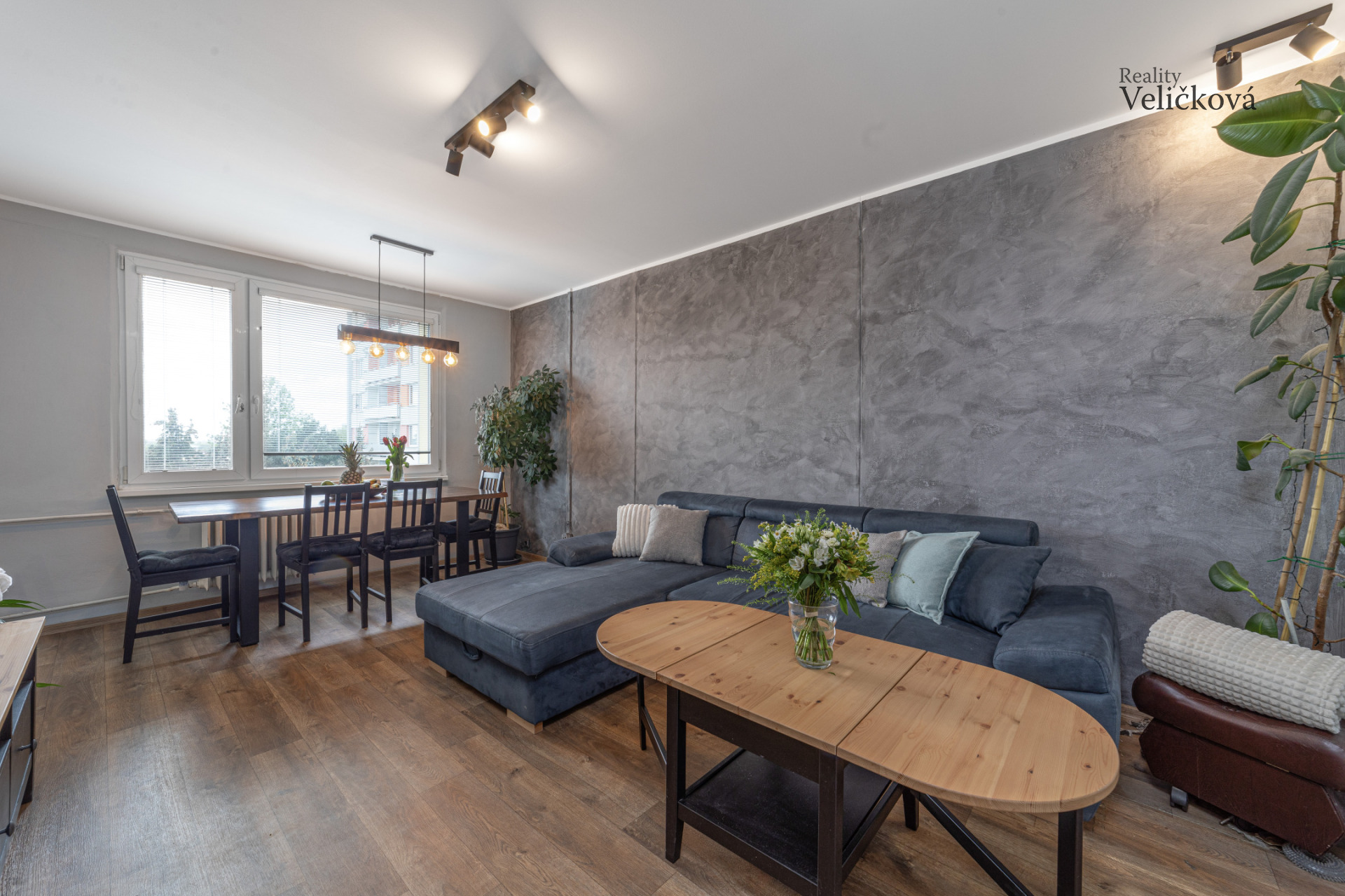 Středobodem bytu je prostorný obývací pokoj propojený s jídelním koutem, který tvoří příjemné místo pro setkávání a odpočinek.