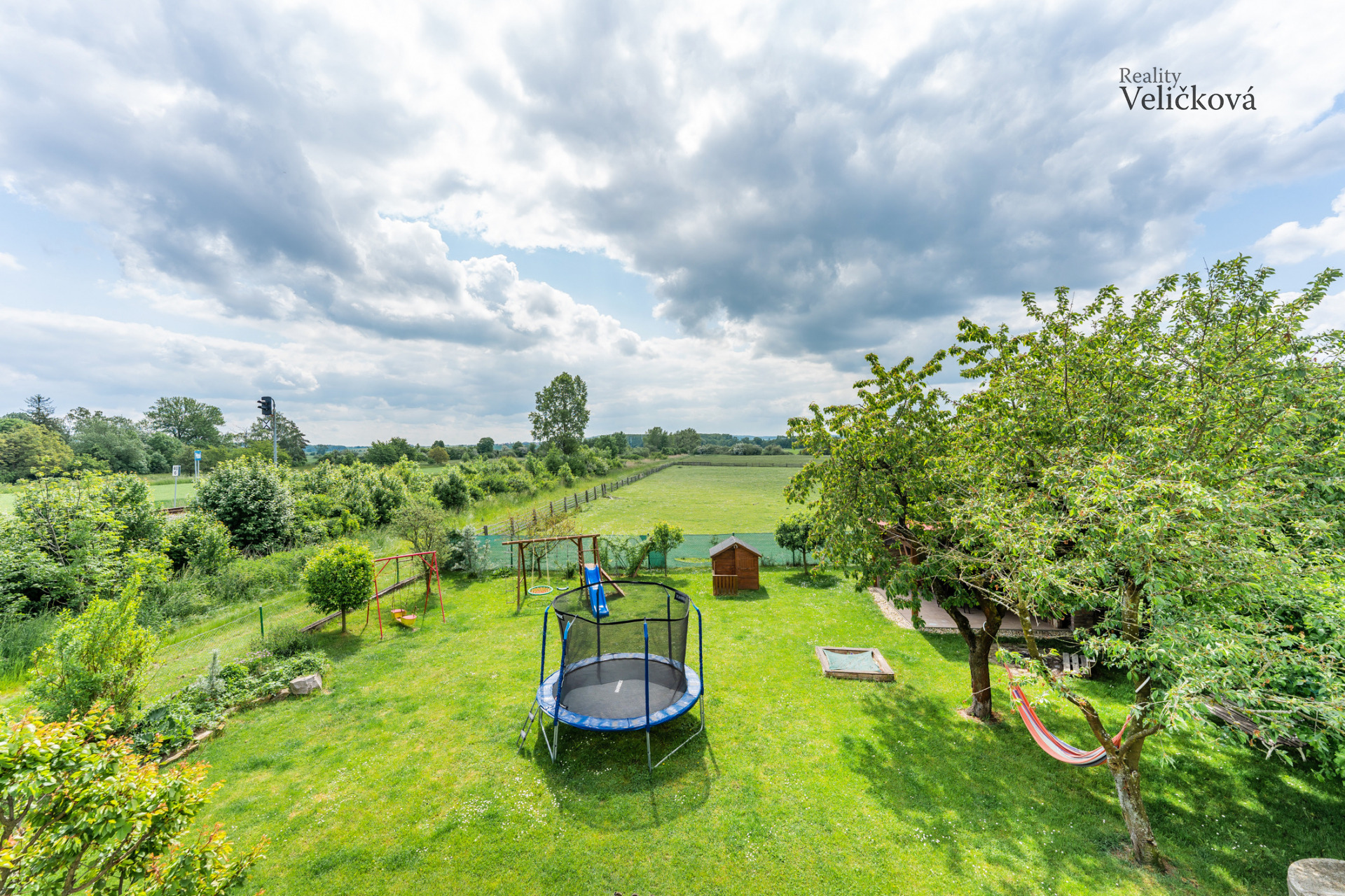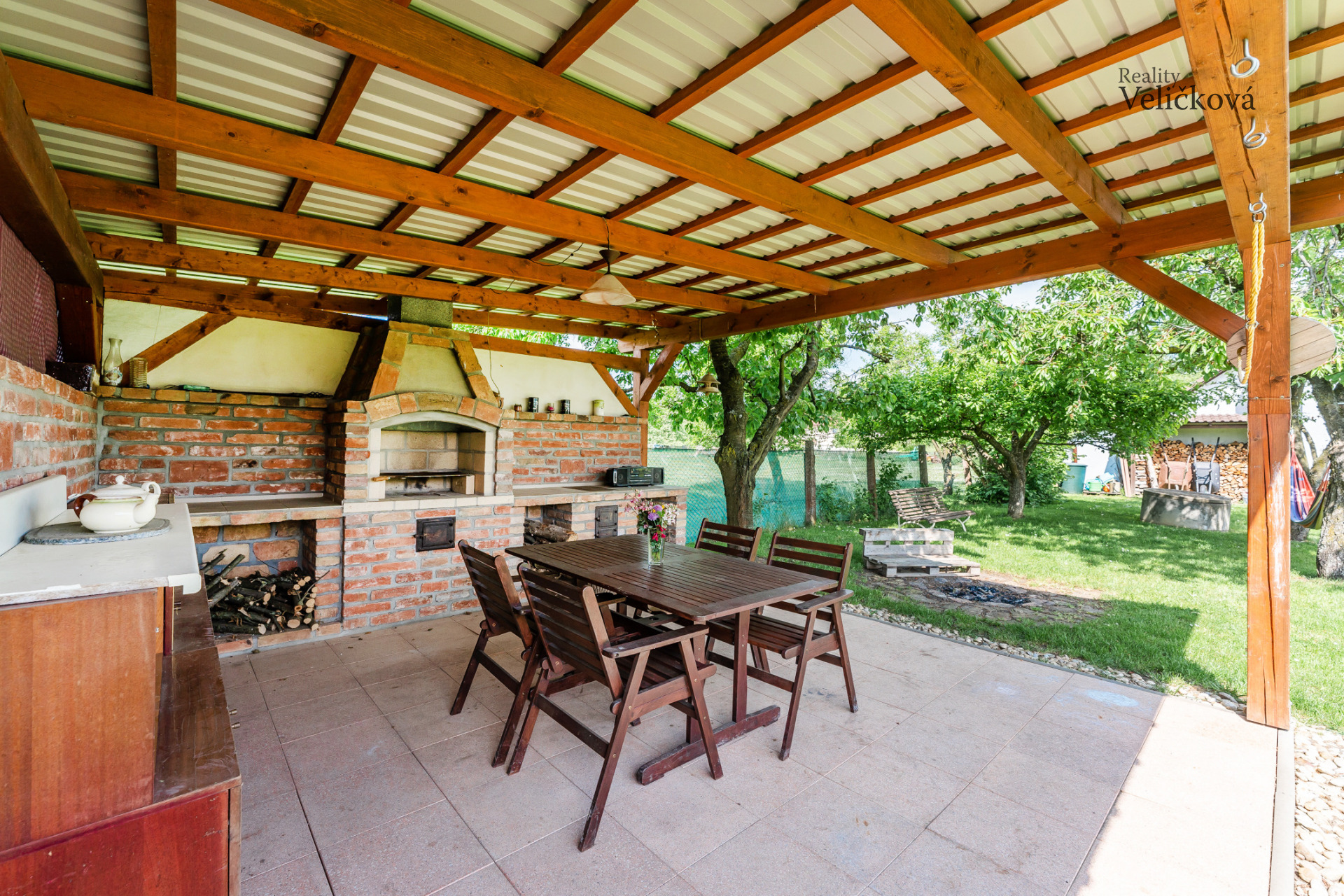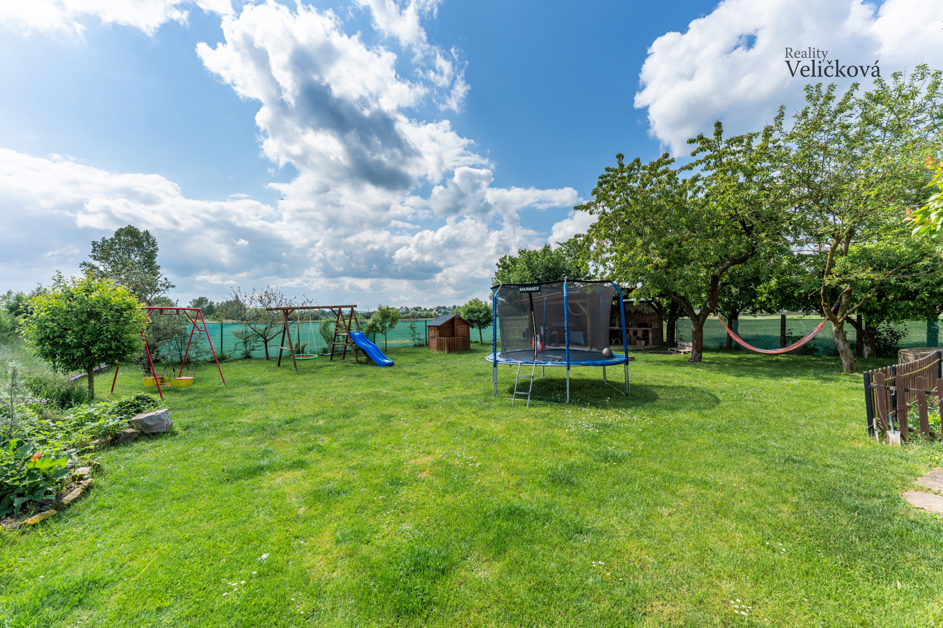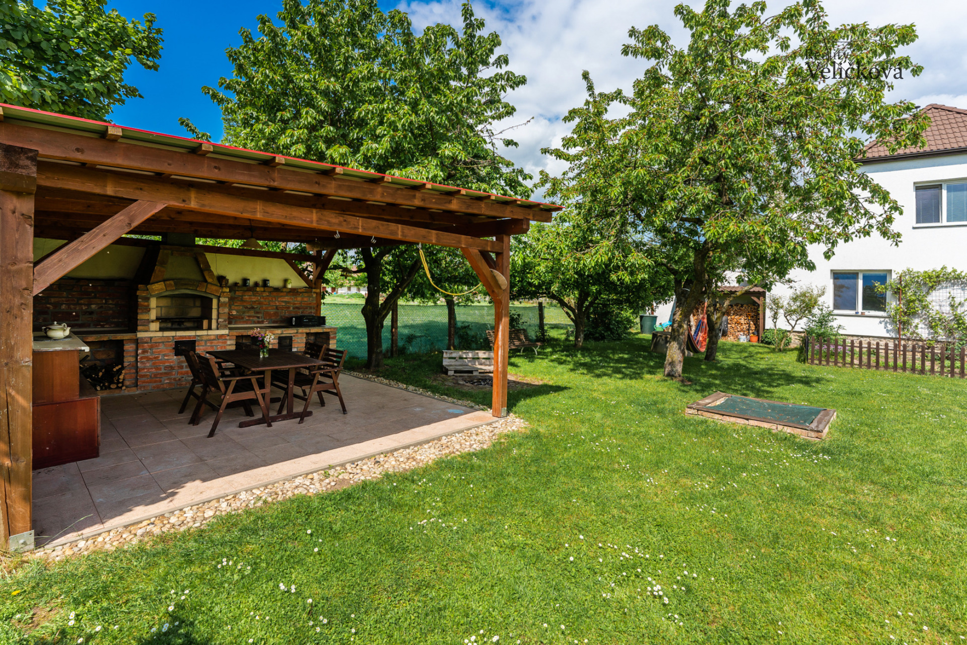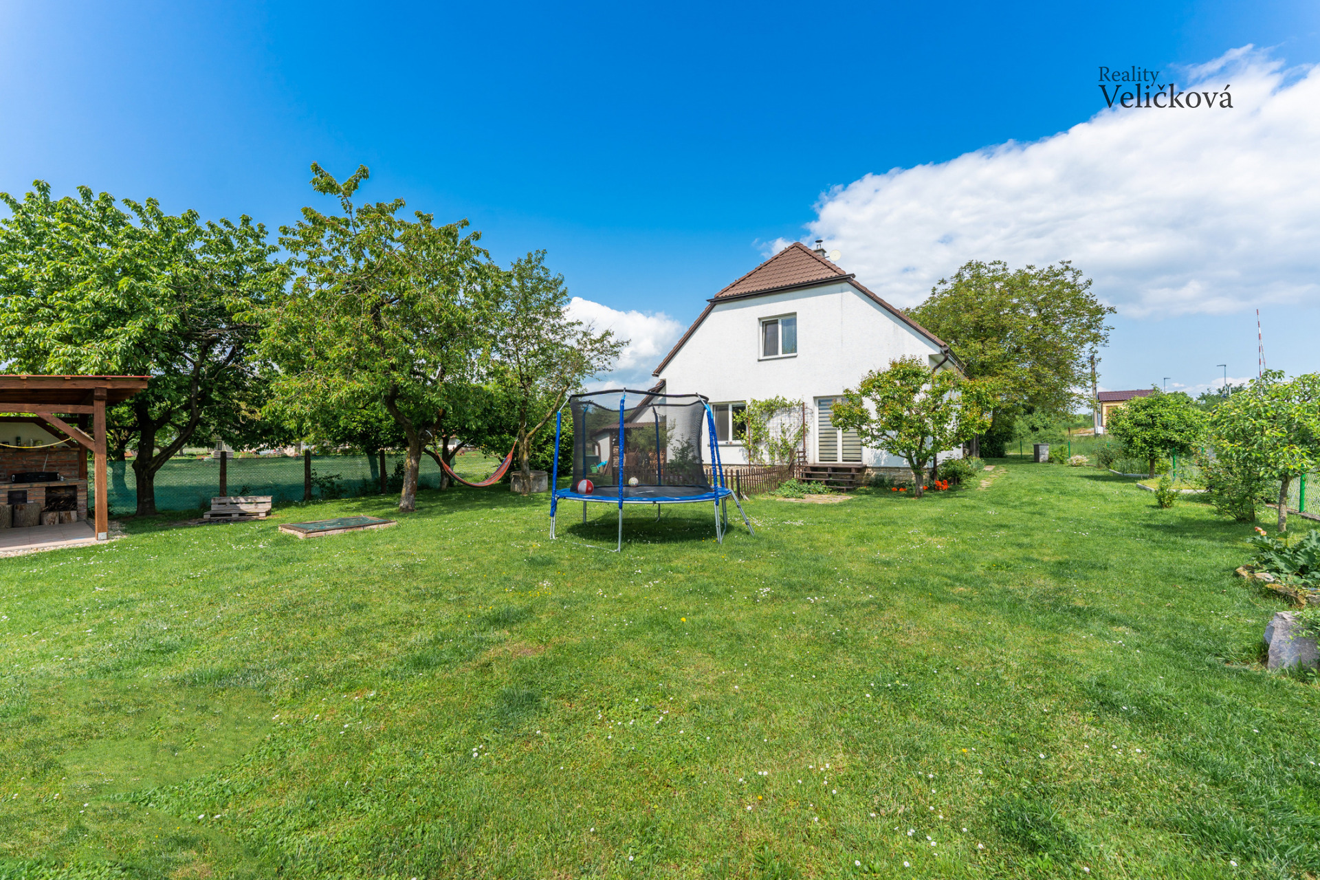 K domu náleží pečlivě udržovaný pozemek o celkové výměře 1007 m². V zahradě se vzrostlými ovocnými stromy jabloně, třešně, meruňka, hruška, švestka se nachází útulný dřevěný altán s krbem, kuchyní, funkční studnou, domkem pro děti a houpačkami.