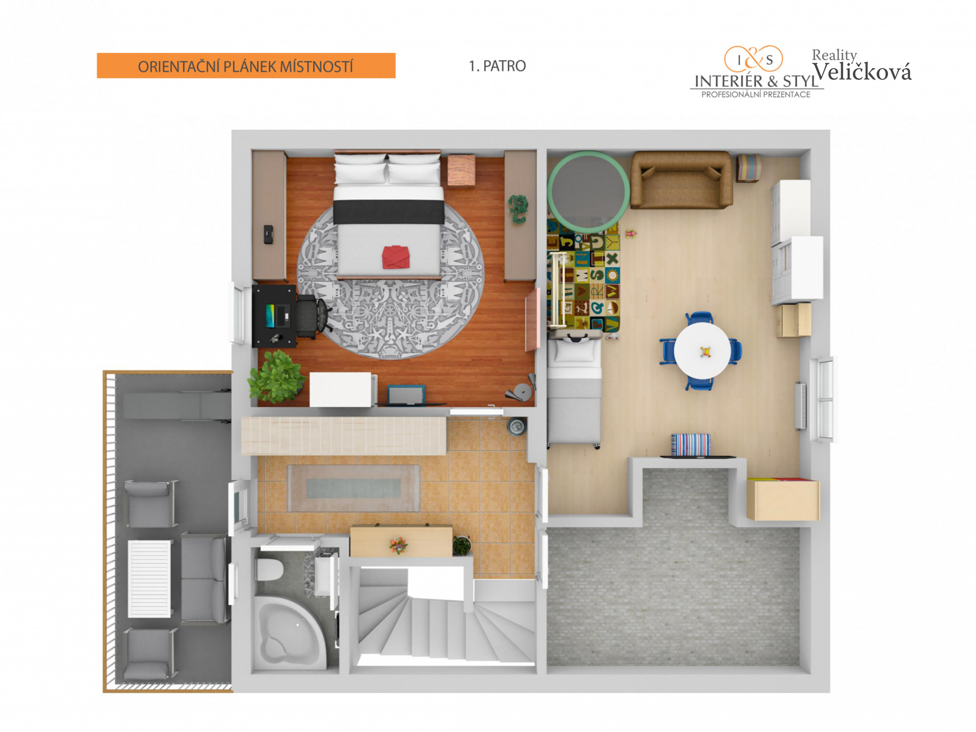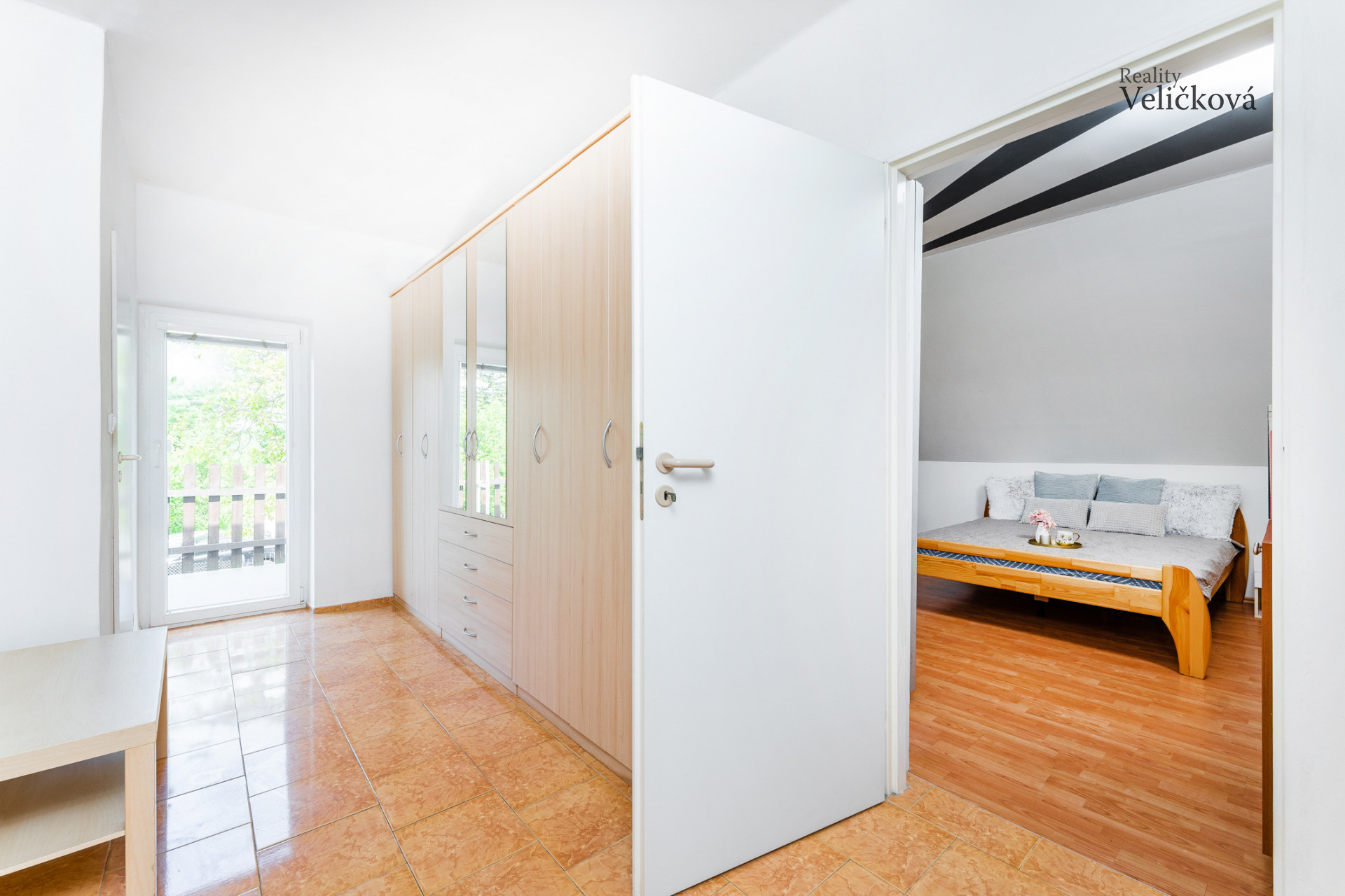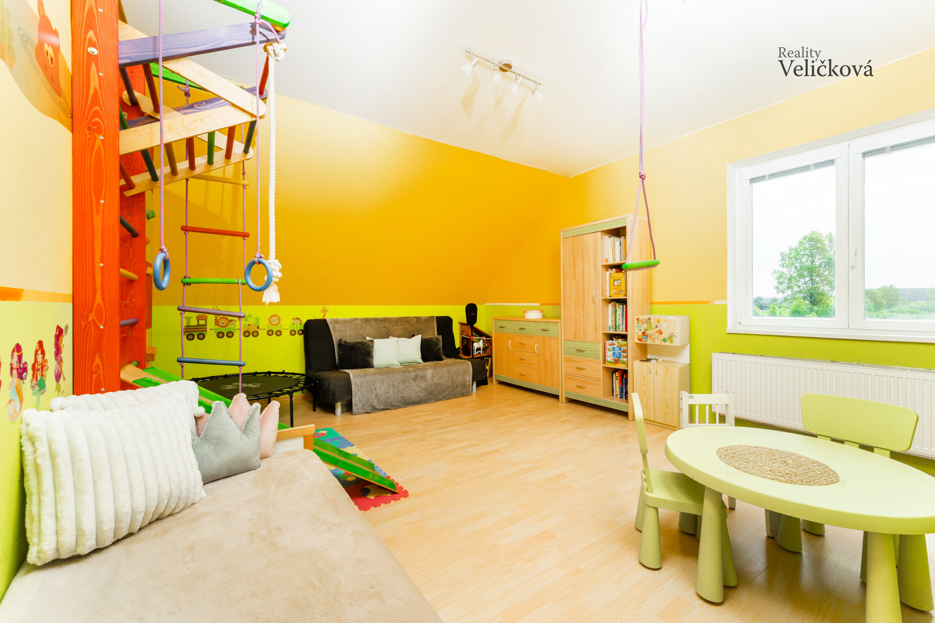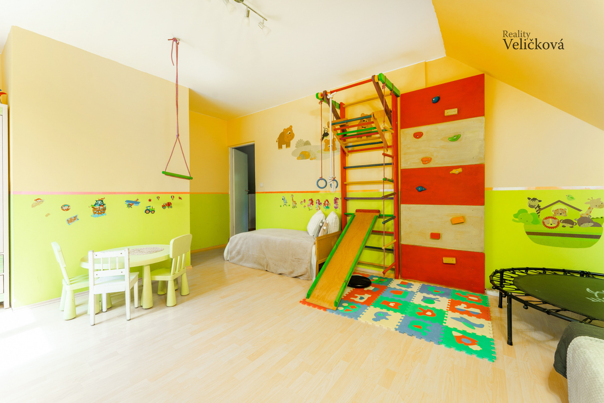 V patře domu se nachází chodba s velkou vestavěnou skříní a vstupem na balkon, prostorný dětský pokoj, kde si děti dostatečně vyhrají díky lezecké stěně, která je součástí prodeje, velký obytný pokoj, který může sloužit jako druhý dětský pokoj nebo pokoj pro hosty, menší koupelna s vanou a WC.