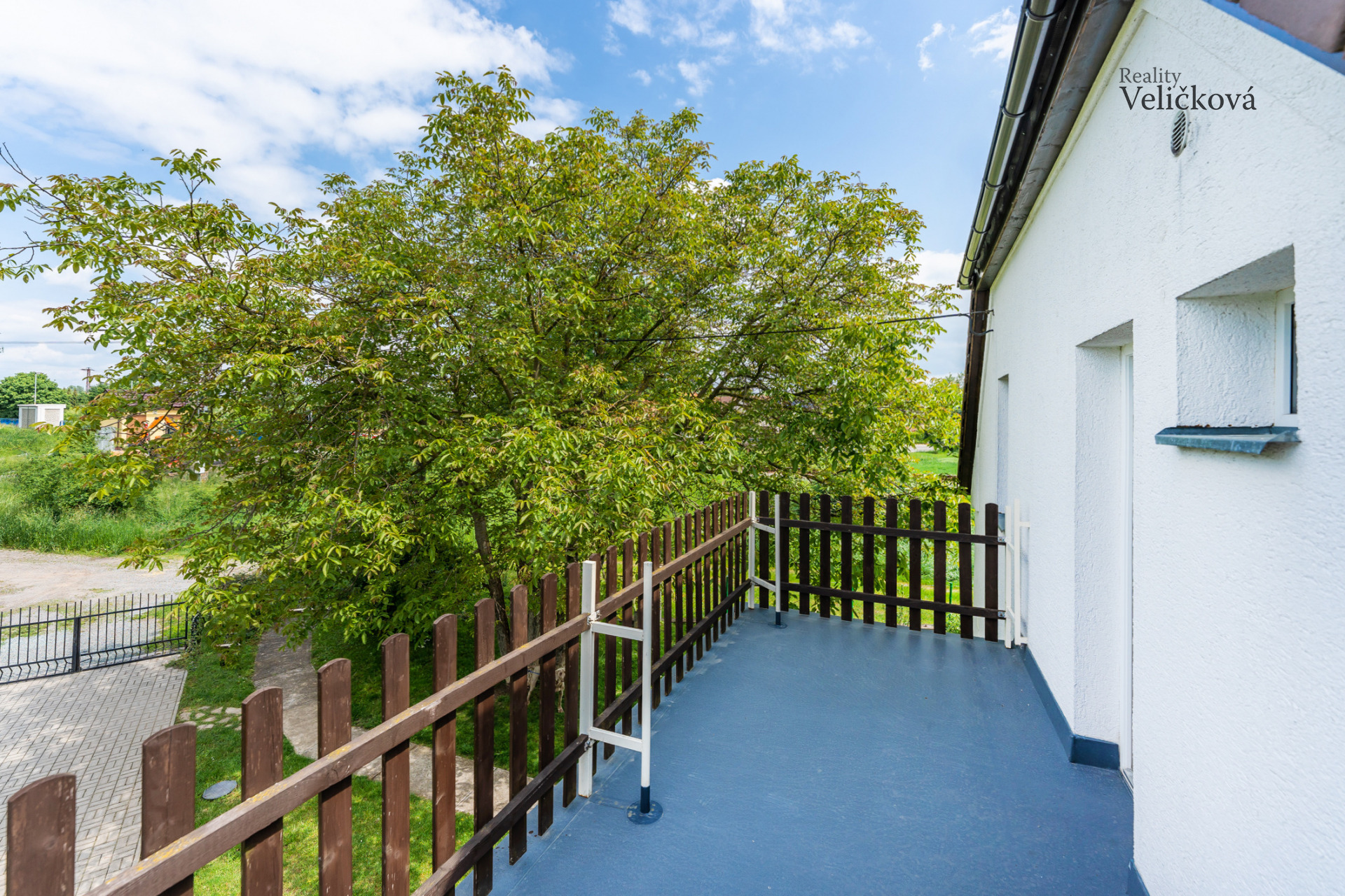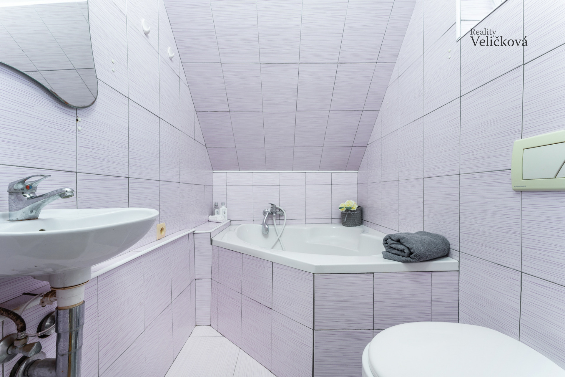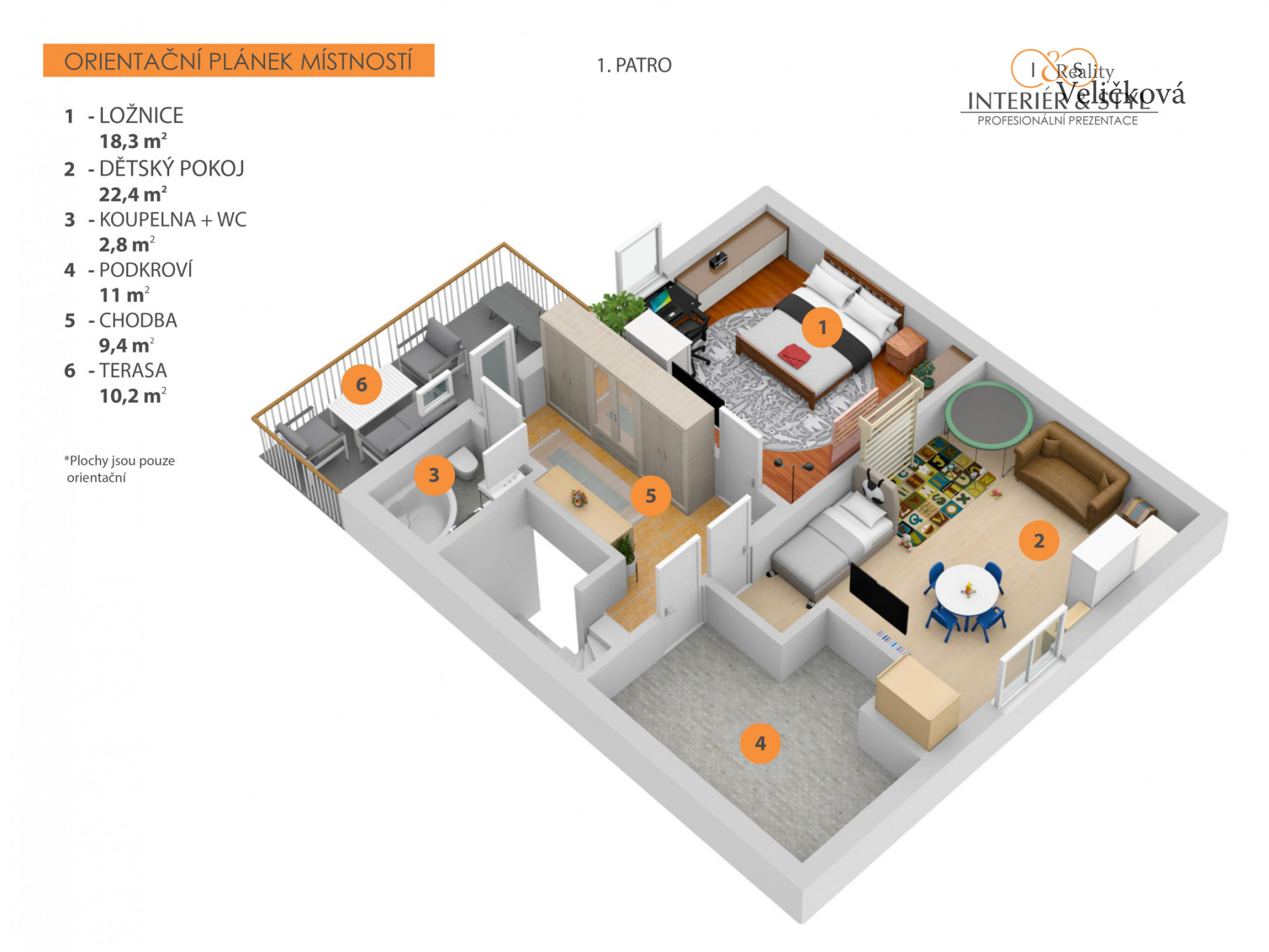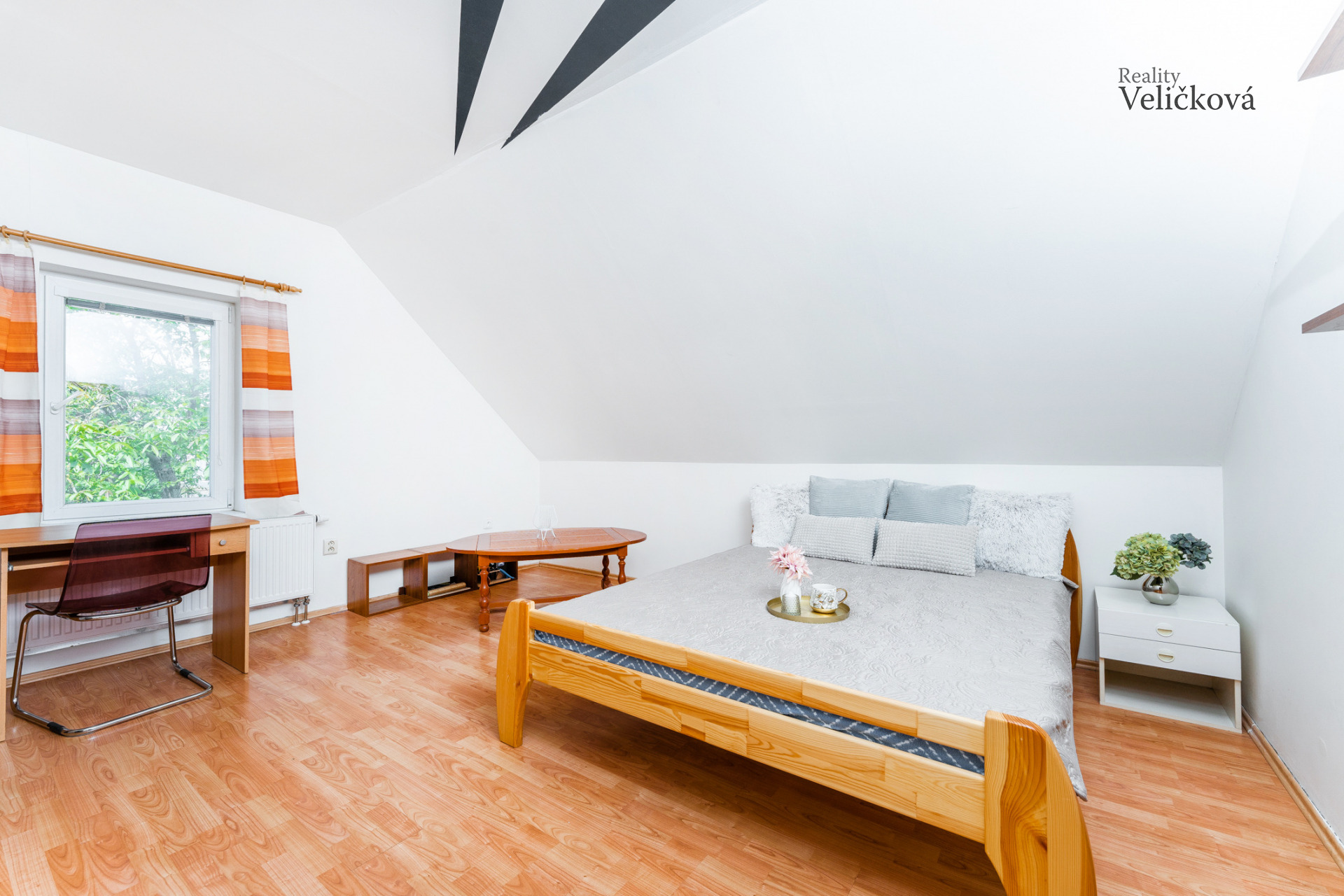 V patře domu se nachází chodba s velkou vestavěnou skříní a vstupem na balkon, prostorný dětský pokoj, kde si děti dostatečně vyhrají díky lezecké stěně, která je součástí prodeje, velký obytný pokoj, který může sloužit jako druhý dětský pokoj nebo pokoj pro hosty, menší koupelna s vanou a WC.