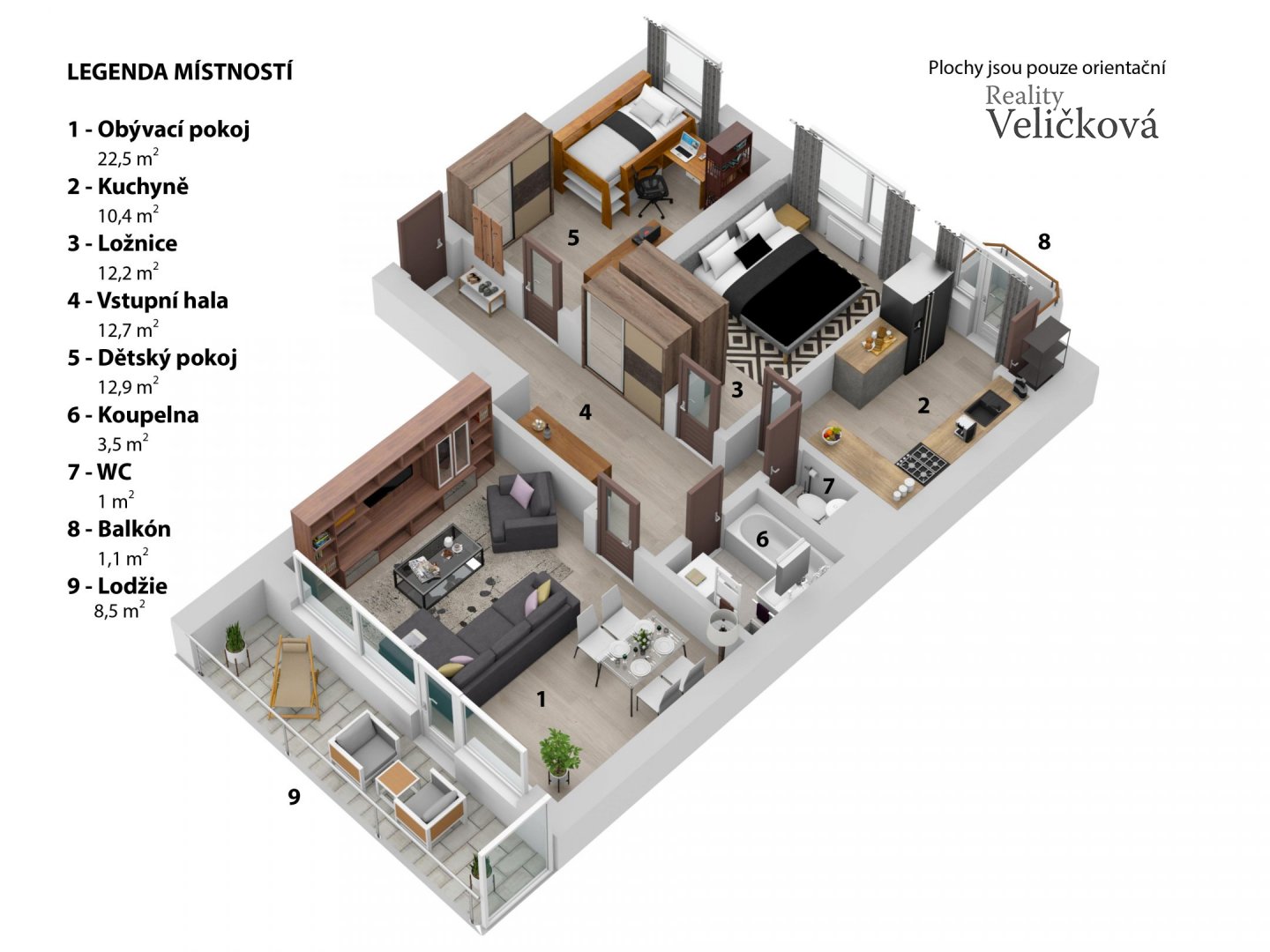 Nemovitost se nachází ve 4. z 5 NP zděného domu z roku 1985, (vstup z ulice z 3.NP, budova je umístěna atypicky ve svahu) ve vyvýšené části Břevnova a nabízí úchvatný výhled na centrum Prahy - na Pražský hrad, Petřín a další architektonické skvosty. Bytová jednotka má výměru 79 m2, (vč. vnitřních příček, půdorys jednotlivých místností s výměrami naleznete ve fotogalerii), výměra balkonů činí 9,6 m2, jednotka se nachází ve velmi dobrém, udržovaném stavu a je připravena ihned k nastěhování. Jižně orientovaný balkon přímo vybízí k posezení a k nasávání jedinečné atmosféry Prahy.