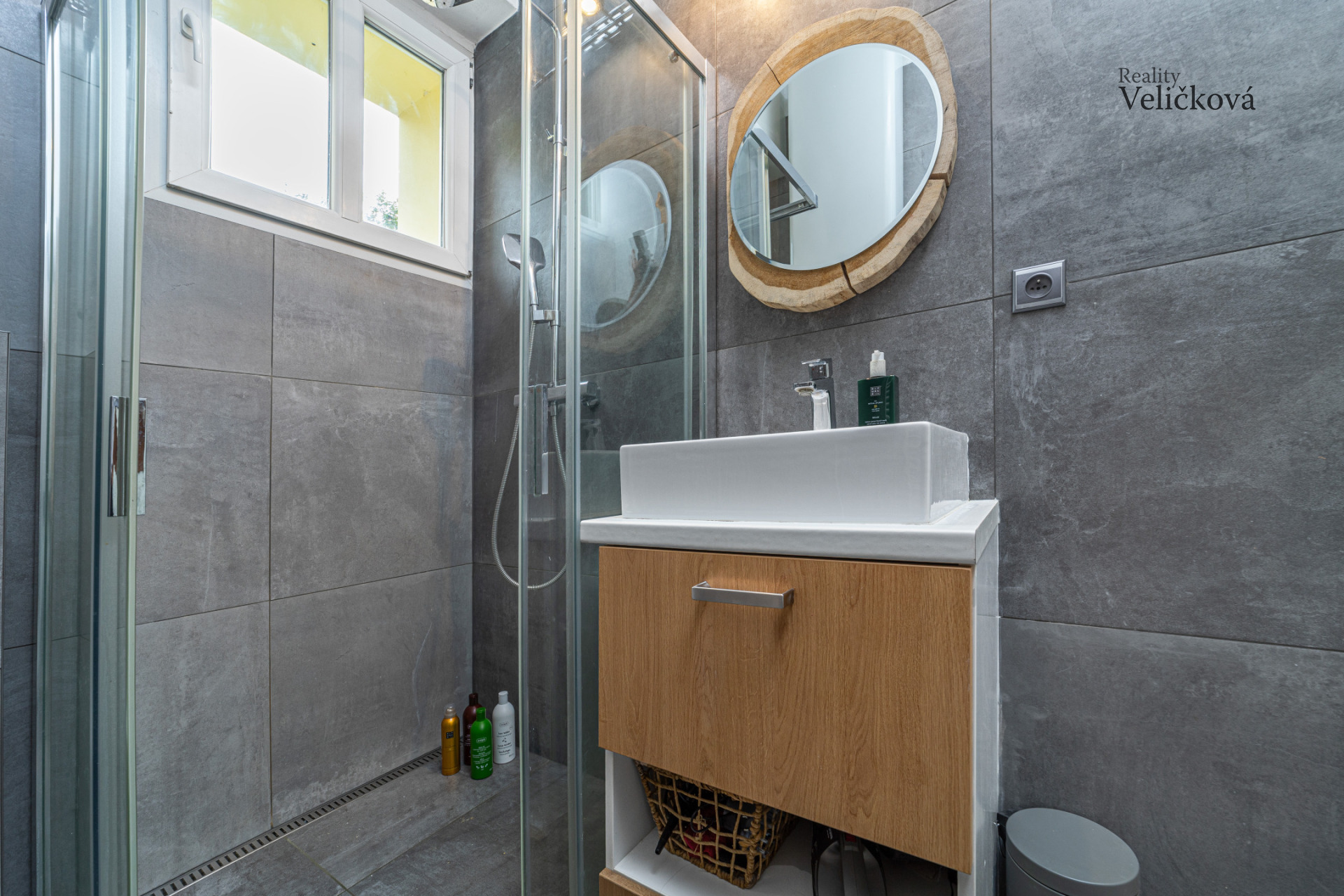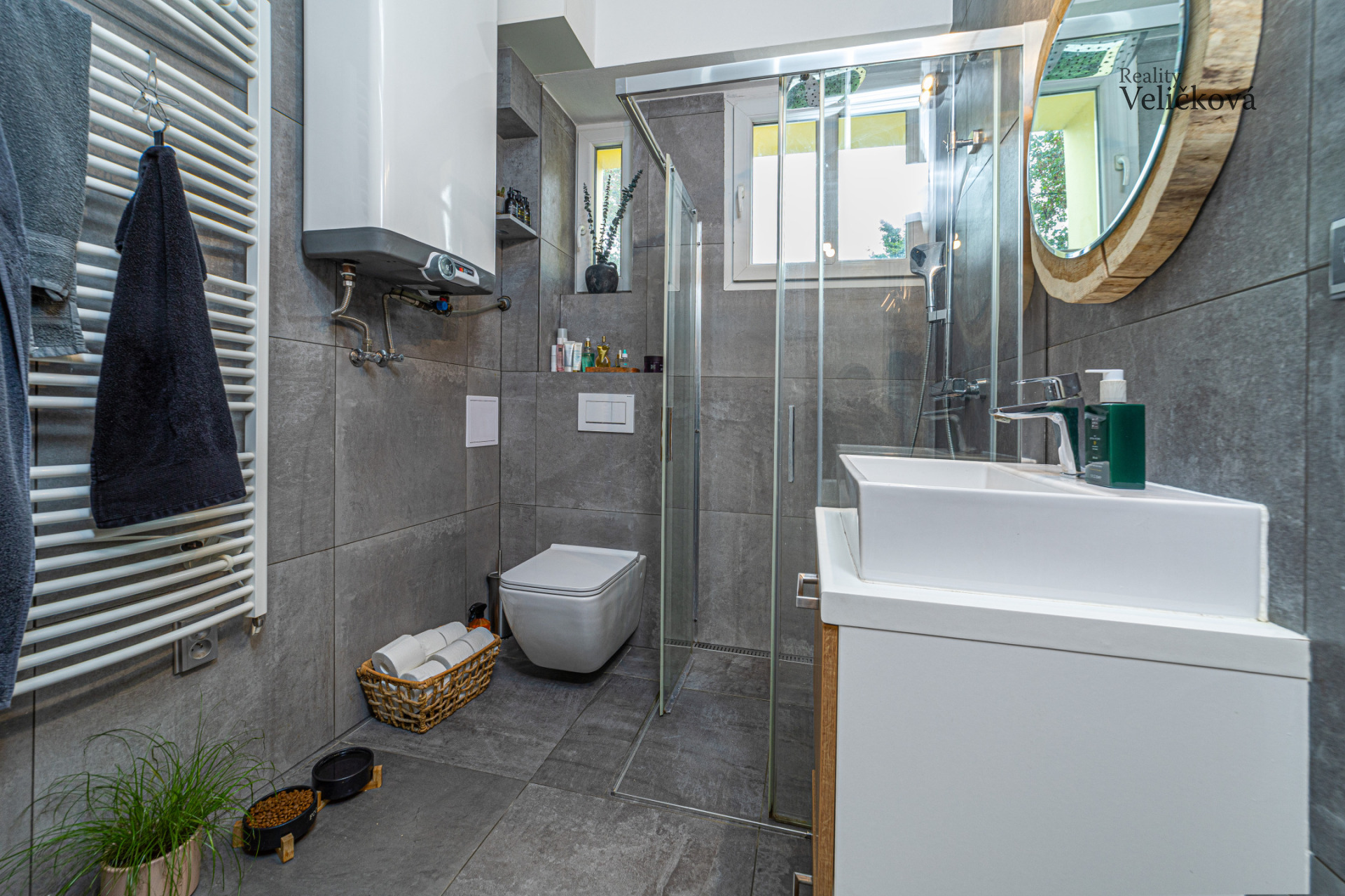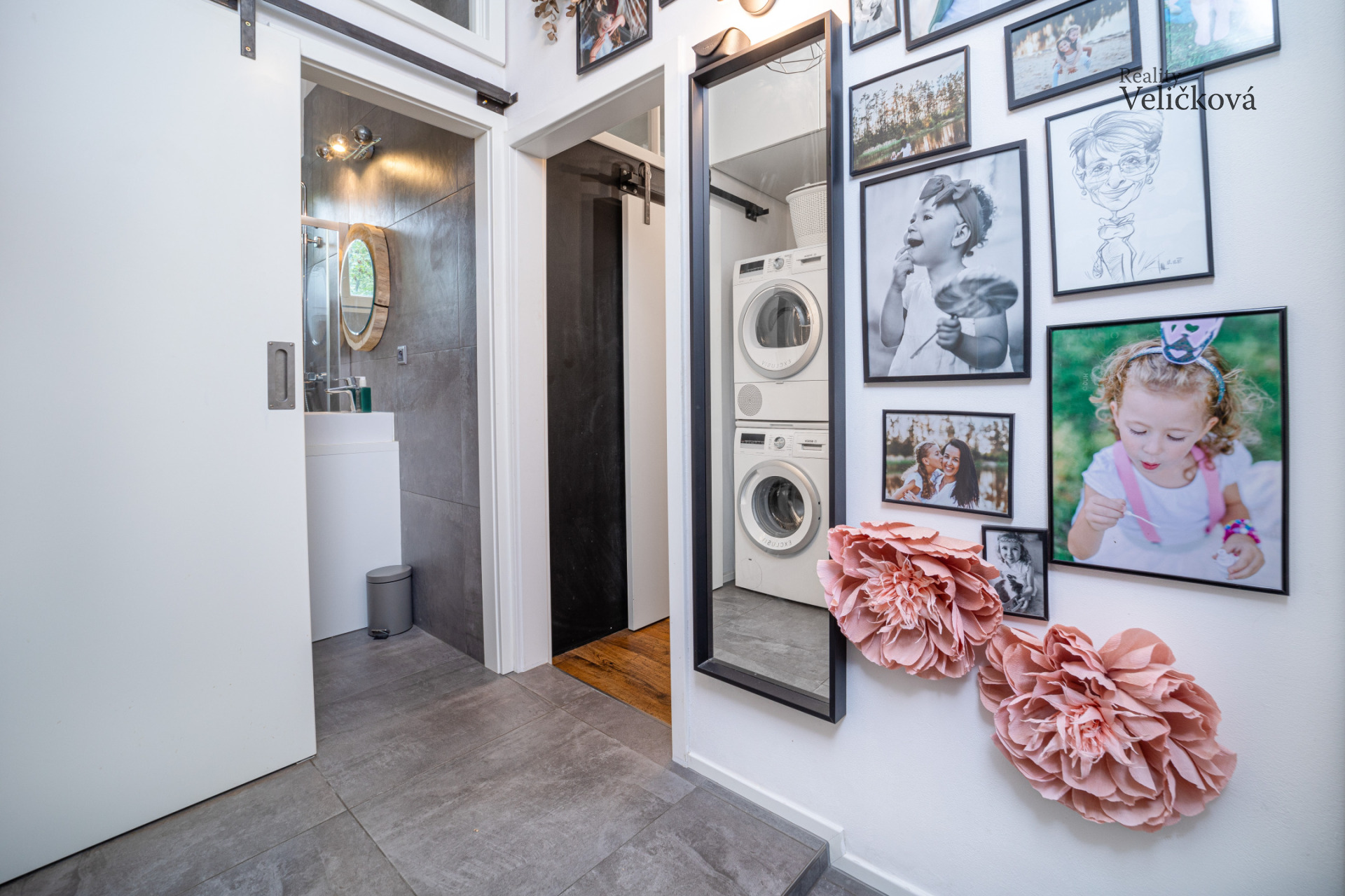 vstupní chodba, koupelna s WC, sprchovým koutem, boilerem a umyvadlem, kuchyň vč. vestavěných spotřebičů (sklokeramická deska, digestoř, trouba, lednice s mrazákem LG, myčka Bosch, mikrovlnná trouba), dětský pokoj s vestavěnou skříní a atypickou vyvýšenou postelí, psacím stolem s elegantním křeslem, obývací pokoj s jídelním koutem, sedací soupravou a vyvýšenou postelí s úložným prostorem a skříní, sklep v přízemí objektu.
