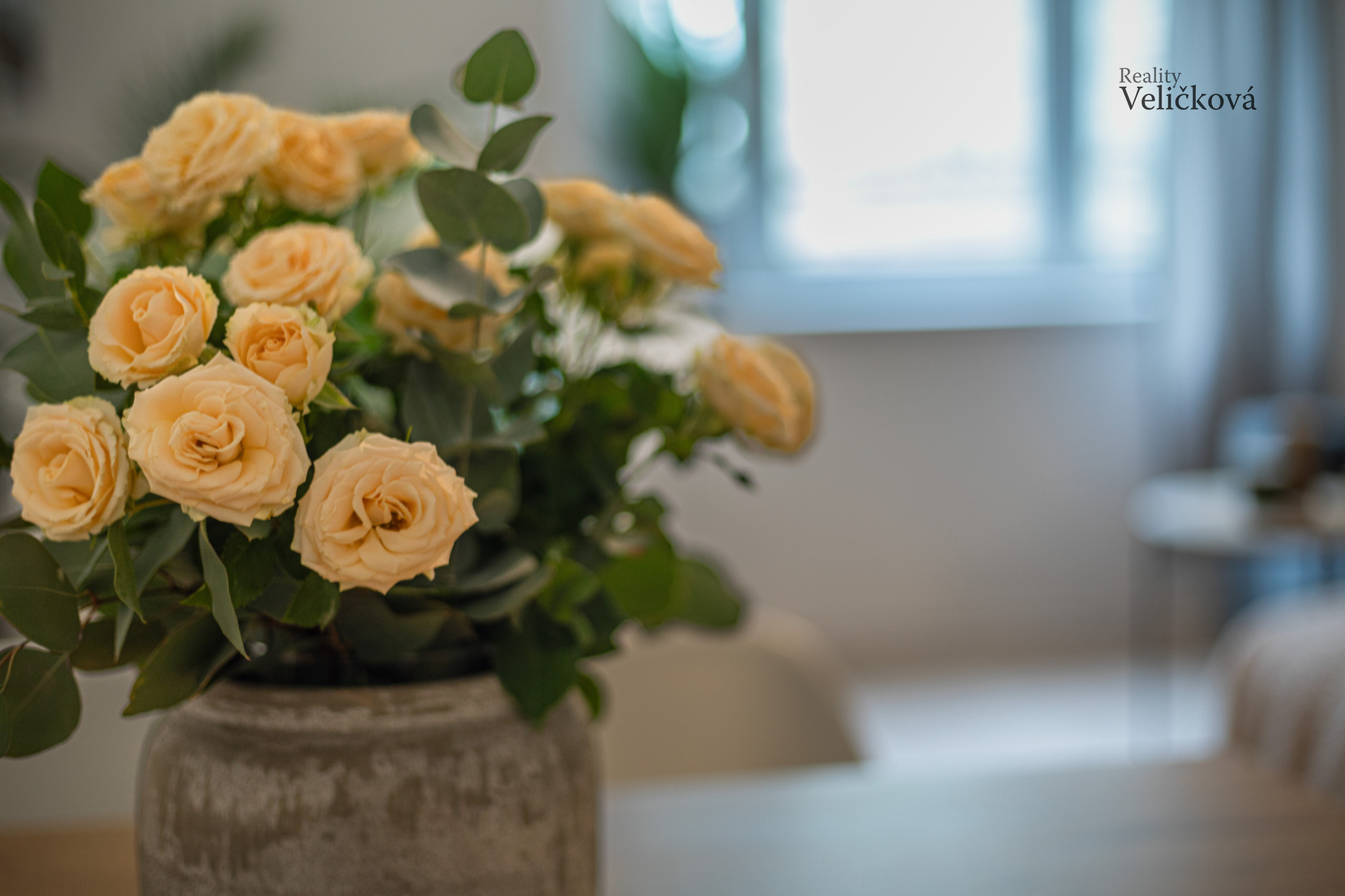 Kuchyň byla vybavena kuchyňskou linkou, obývací pokoj pohodlným nábytkem a ložnice nabízí manželskou postel v patře a dostatečné úložné prostory. Vytápění bytu zajišťují elektrické stropní panely s možností individuální regulace teploty pro každý pokoj.