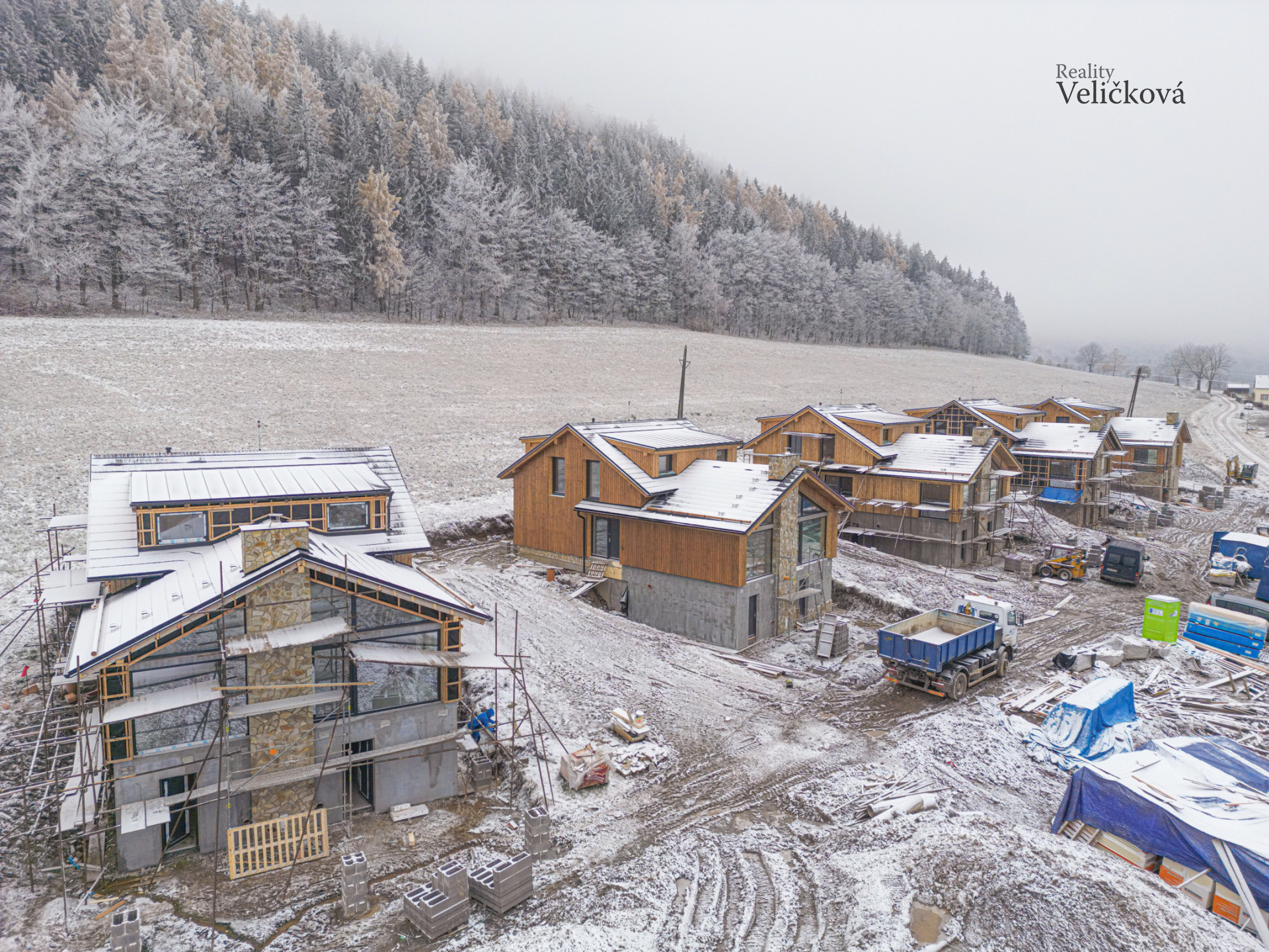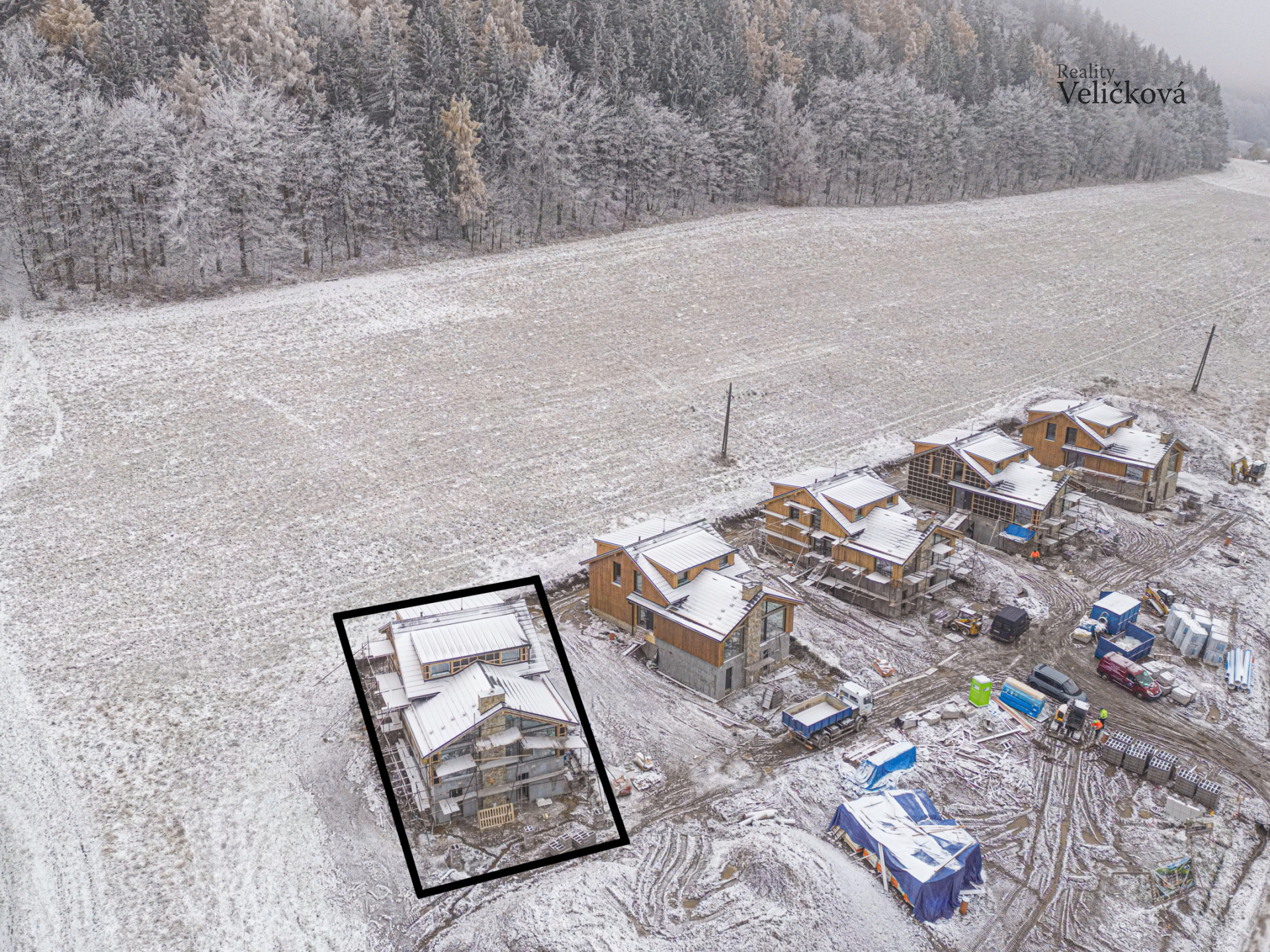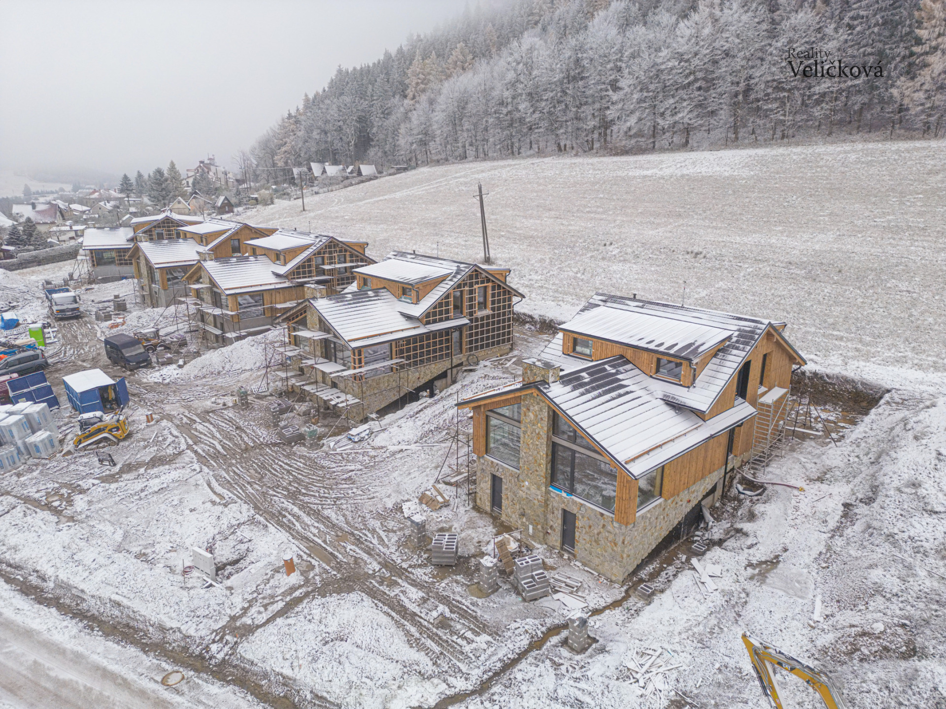 Prodáme poslední luxusní horskou vilu (dům č. 1) z celkového počtu 5-ti tzv. "Rýchorských vil" v obci Bobr (Žacléř) u Trutnova. Lokalita se nachází v překrásné krkonošské přírodě s panoramatickým výhledem na Vraní hory na mírném kopci nad obcí. Aktuálně se stavba blíží do finální fáze. Dokončují se fasády, interiéry a budou se instalovat terasy. Vila č. 1 (první zleva) bude mít podlahovou plochu 152,62 m2, náleží k ní 2 sklepy (43 m2) a terasa (54 m2). Výměra pozemku činí 1107 m2.