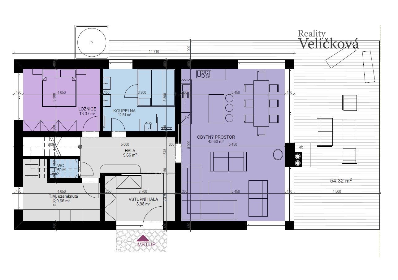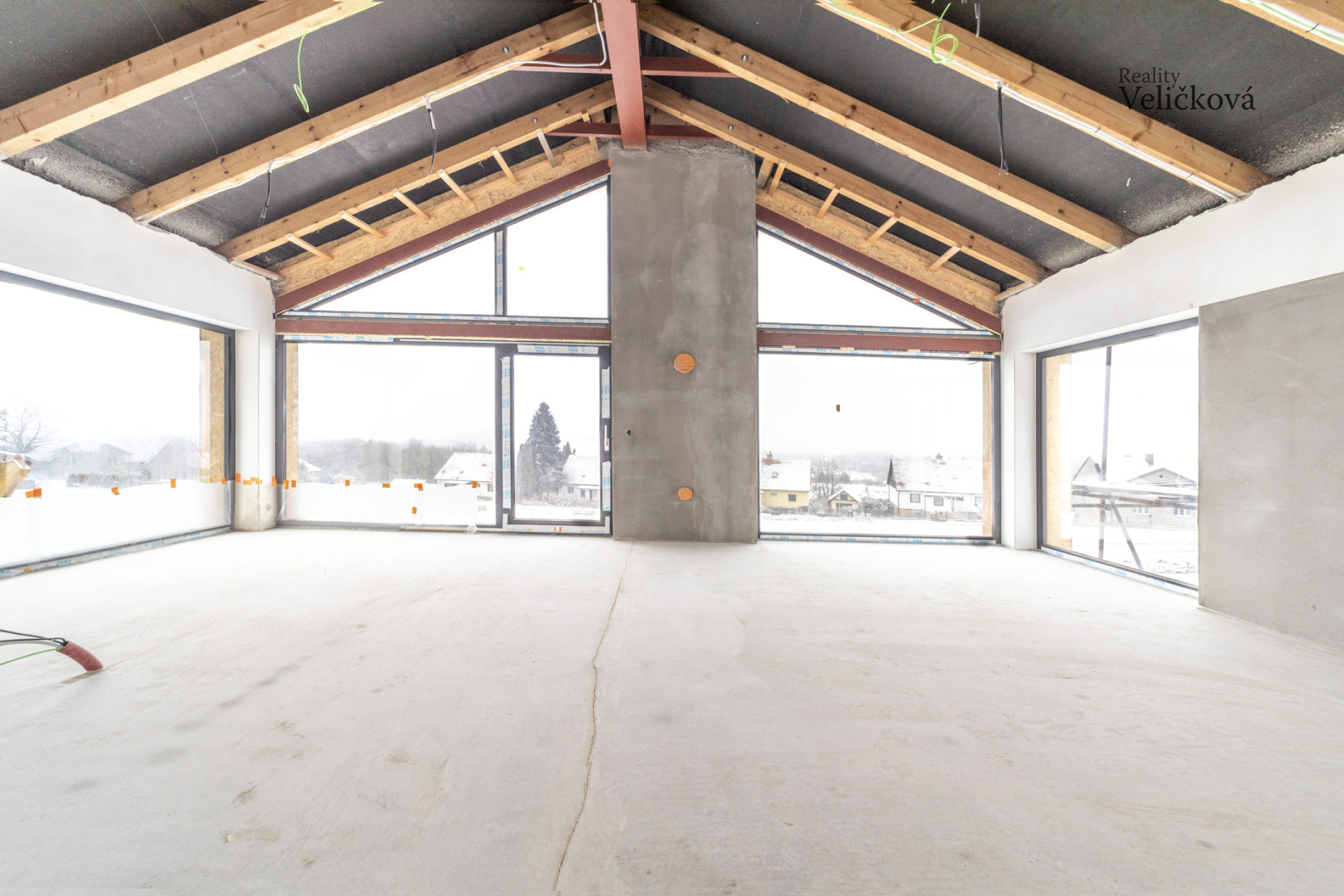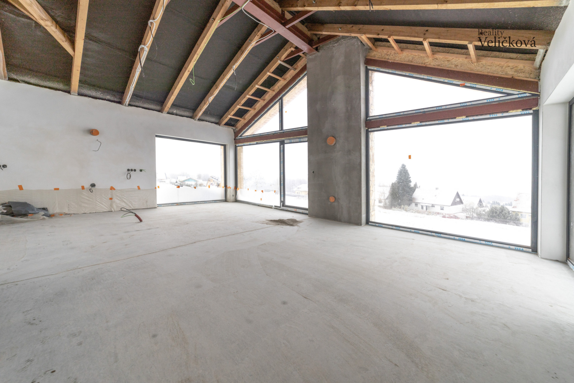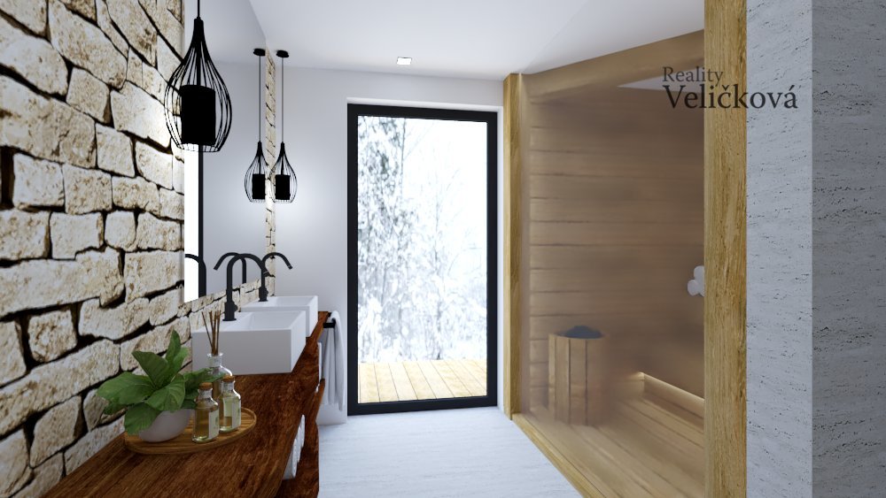 Pod terasou se nachází 2 krytá garážová stání a vstup do 2 technických místností na uložení všeho potřebného, co do interiéru nepatří, nebo je zde možné vybudovat rozšířené wellness. Součástí koupelny v 2. NP je sauna, ze které pohodlně vyjdete bočním vchodem na terasu. Prostorný obývací pokoj s panoramatickým oknem nabízí výhled na Vraní hory.