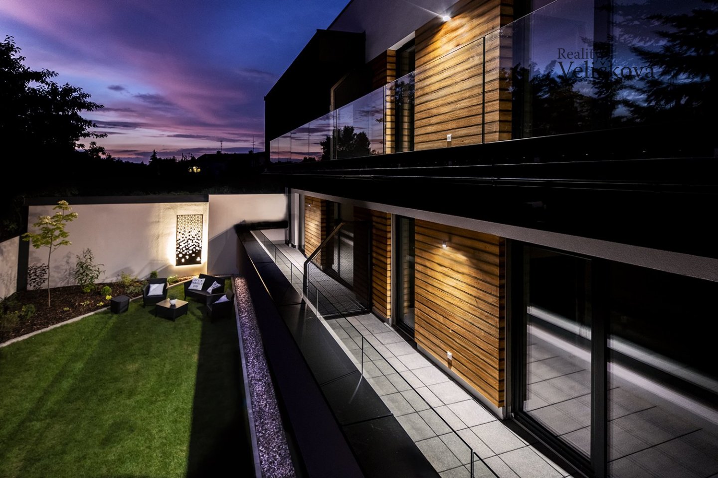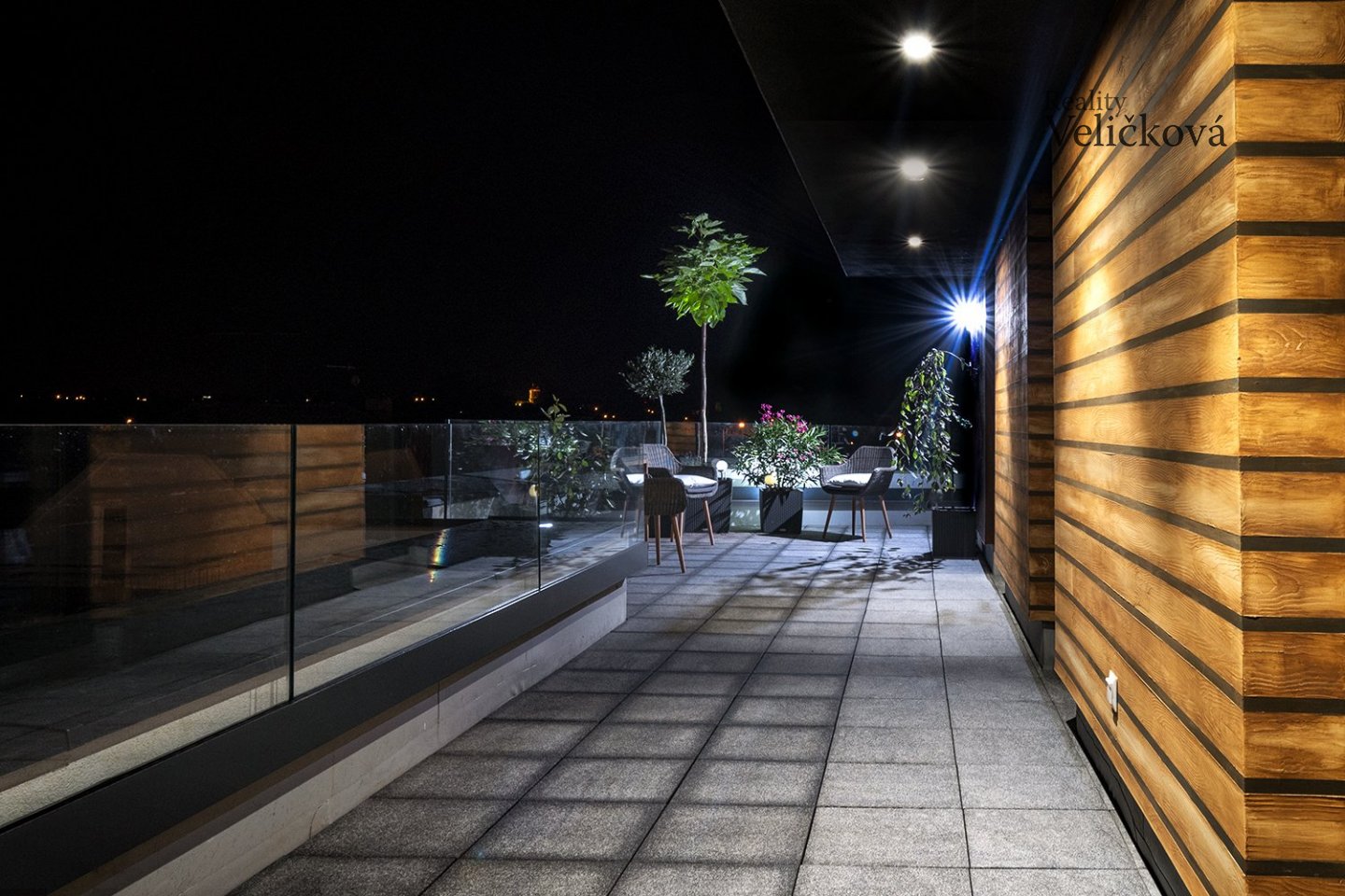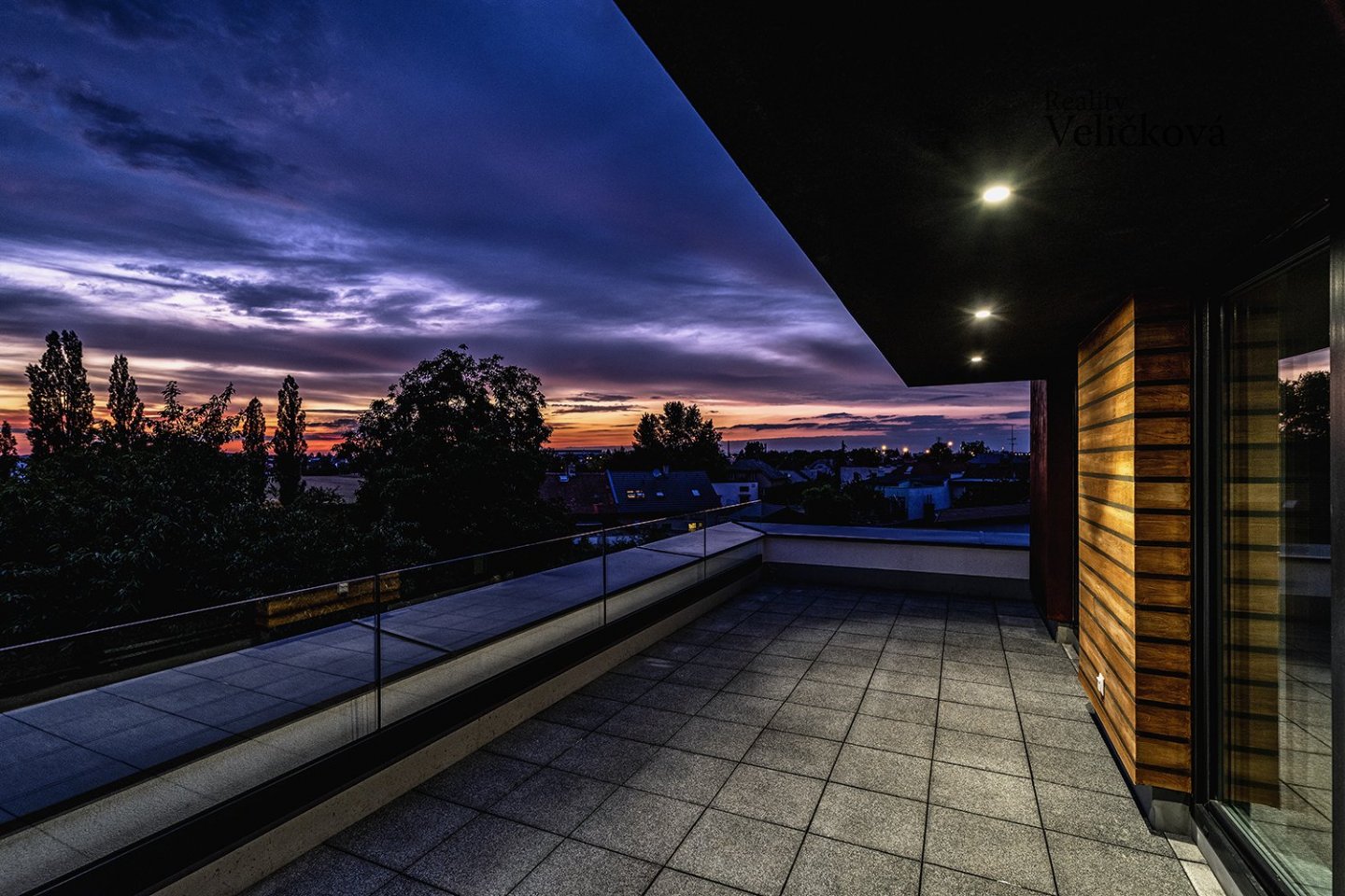 Nabízíme luxusní byt 3+kk v novostavbě o výměře 114 m2, z toho terasa 14 m2 s orientací na západ s nádherným výhledem na zahrady. Rezidence je vybudována uprostřed staré zástavby a je určena klientům, kteří ocení, že si svůj domov nepořizují na novém sídlišti, ale v klidné vilové čtvrti. Uzavřený komplex nabízí bezpečnou podzemní garáž, výtah a krásně upravenou vnitřní privátní zahradu. Residence má celkově pouze 14 bytových jednotek. Standardy projektu zahrnují okna s izolačním trojsklem, sádrové omítky, vinylové podlahy, bezfalcové interiérové dveře, velkoformátovou Italskou keramiku, koupelnovou sanitu se zařizovacími předměty značky Grohe. Dále na balkónech a terasách dlažbu na terčích a skleněné zábradlí.