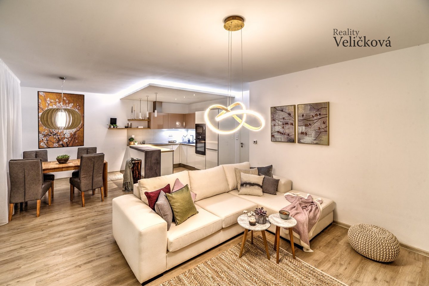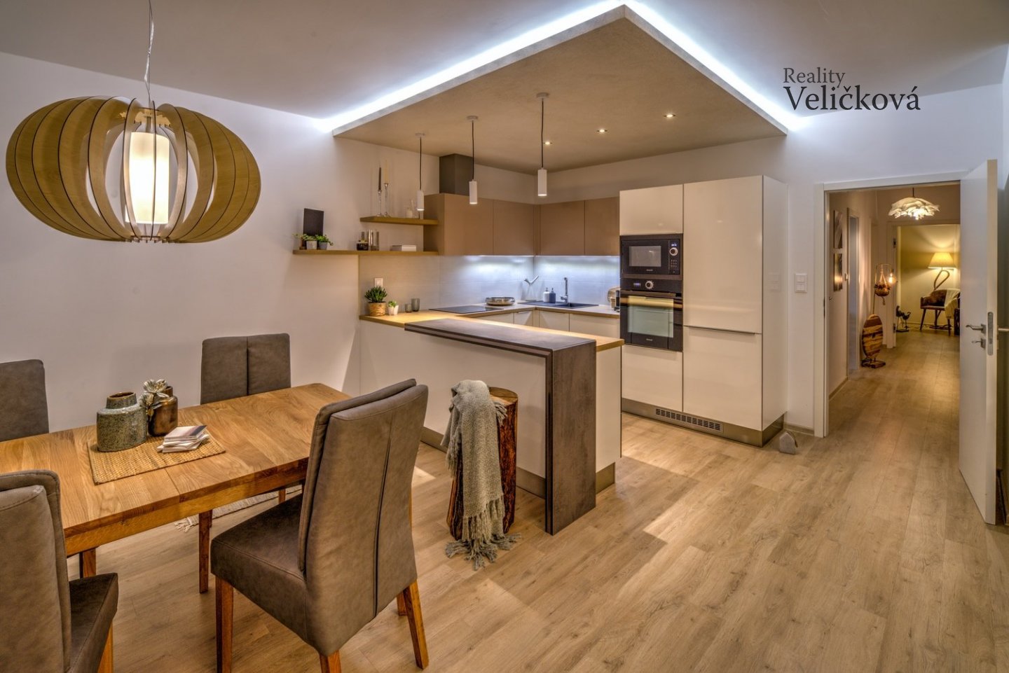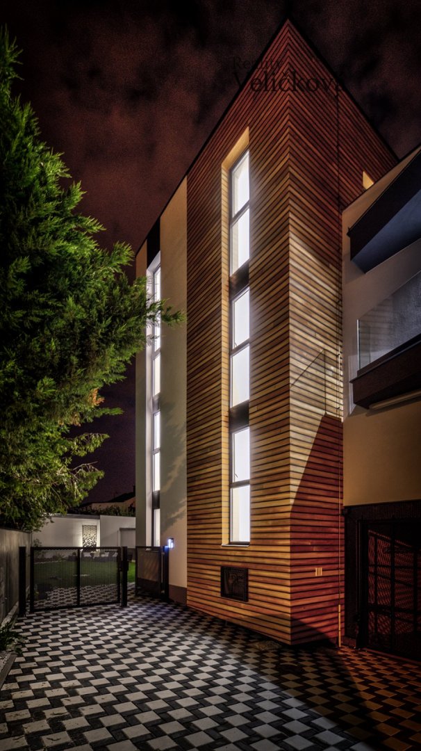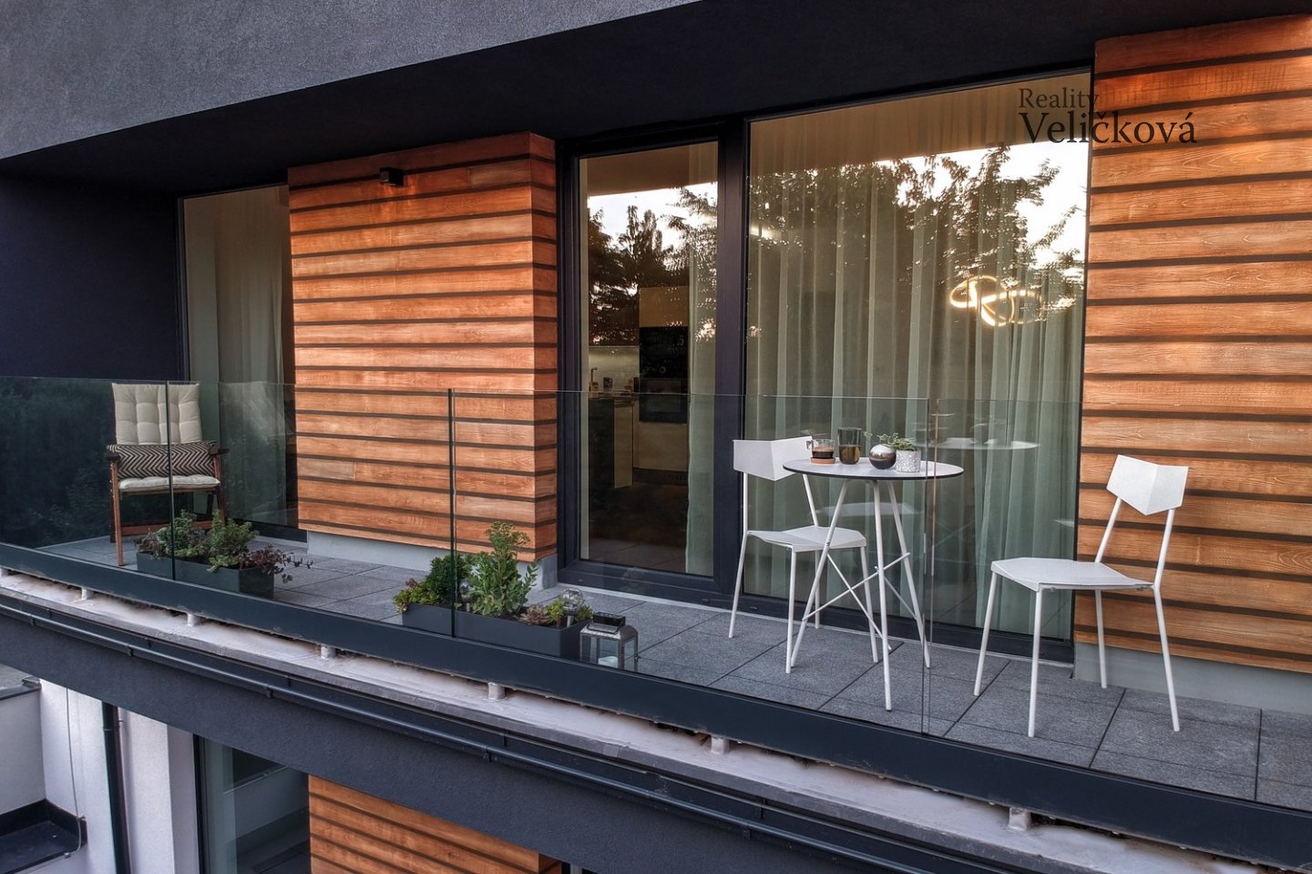 Nabízíme luxusní byt 3+kk v novostavbě o výměře 114 m2, z toho terasa 14 m2 s orientací na západ s nádherným výhledem na zahrady. Rezidence je vybudována uprostřed staré zástavby a je určena klientům, kteří ocení, že si svůj domov nepořizují na novém sídlišti, ale v klidné vilové čtvrti. Uzavřený komplex nabízí bezpečnou podzemní garáž, výtah a krásně upravenou vnitřní privátní zahradu. Residence má celkově pouze 14 bytových jednotek. Standardy projektu zahrnují okna s izolačním trojsklem, sádrové omítky, vinylové podlahy, bezfalcové interiérové dveře, velkoformátovou Italskou keramiku, koupelnovou sanitu se zařizovacími předměty značky Grohe. Dále na balkónech a terasách dlažbu na terčích a skleněné zábradlí.