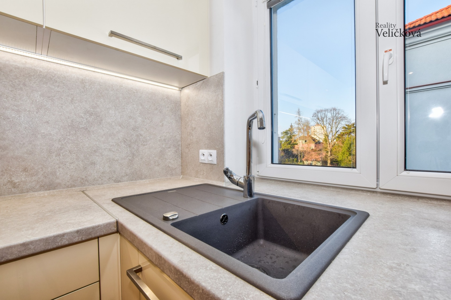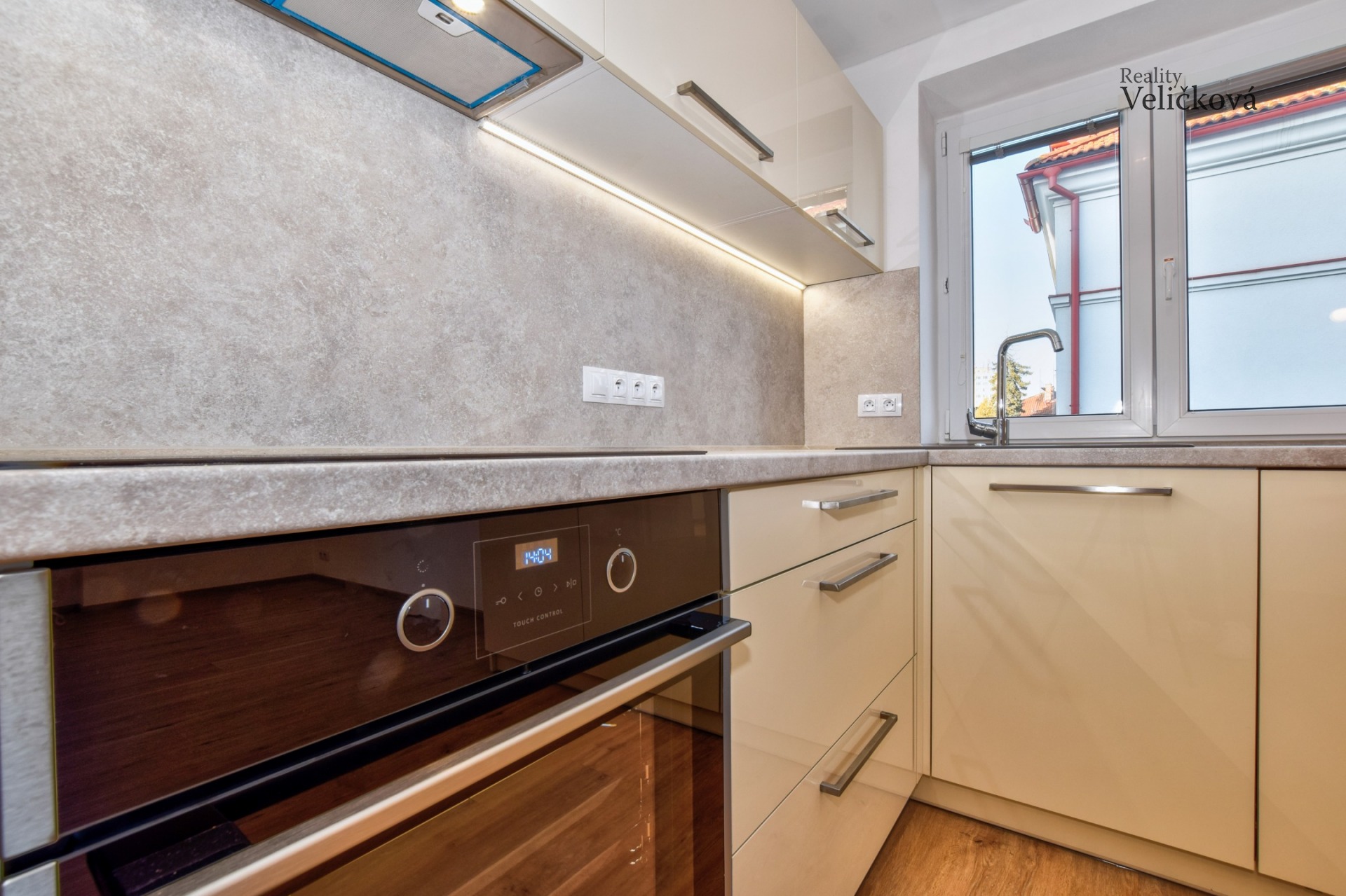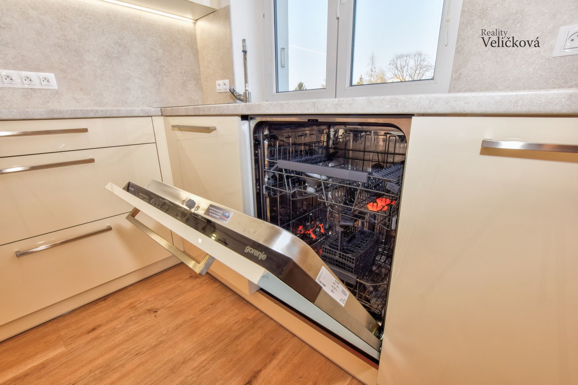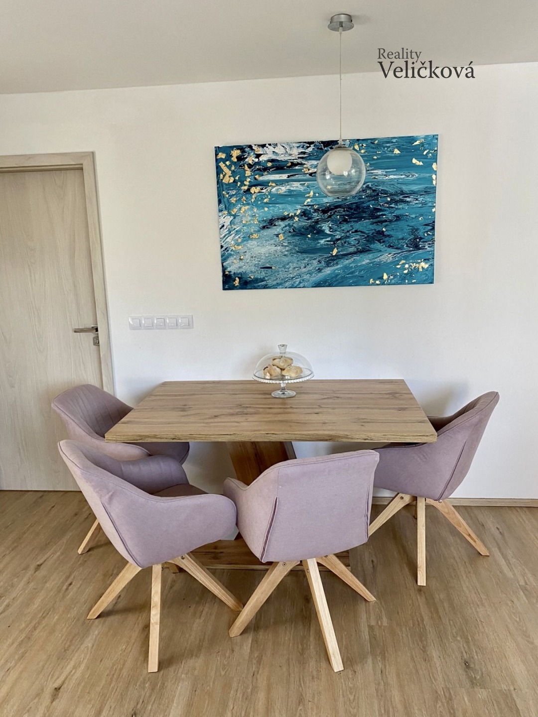 - kuchyň s moderní kuchyňskou linkou se zabudovanými spotřebiči (indukční deska, el. trouba, lednice s mrazákem, digestoř, myčka) a obývacím pokojem s jídelním prostorem vybaveným jídelním stolem a elegantními křesílky