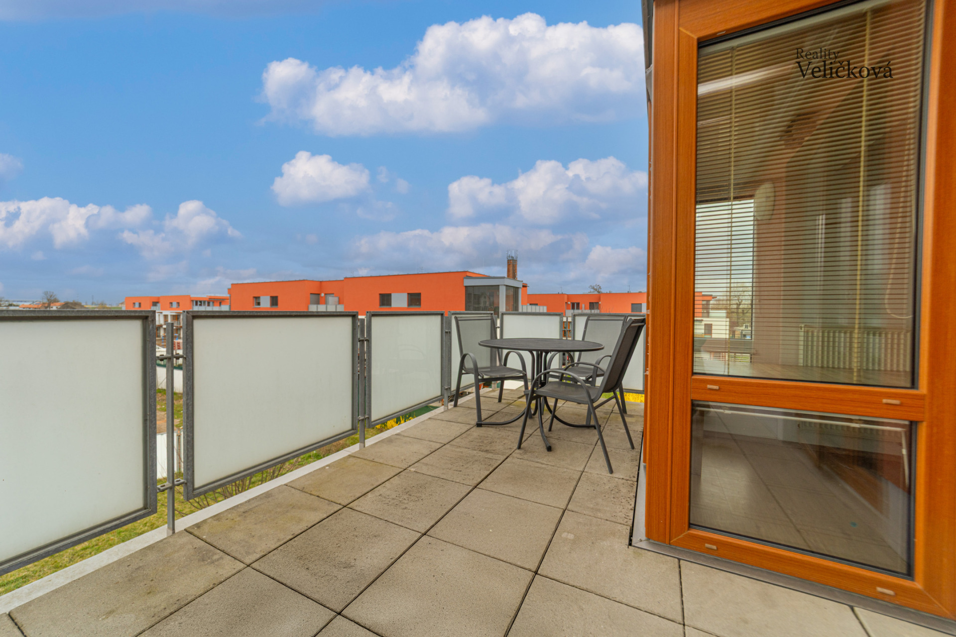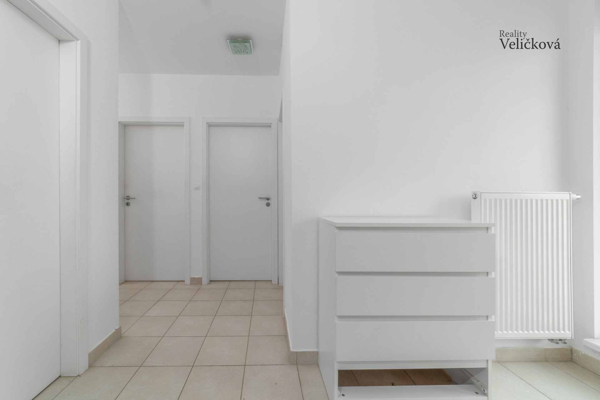 Dispozice bytu: prostorná vstupní chodba, úložná komora/šatna, toaleta se závěsným WC, koupelna s vanou, umyvadlem, prostorem pro pračku a žebříkovým radiátorem, prostorný obývací pokoj s kuchyňským koutem a se vstupem na velkou terasu a dvě ložnice se vstupem na menší terasu orientovanou na západní stranu.