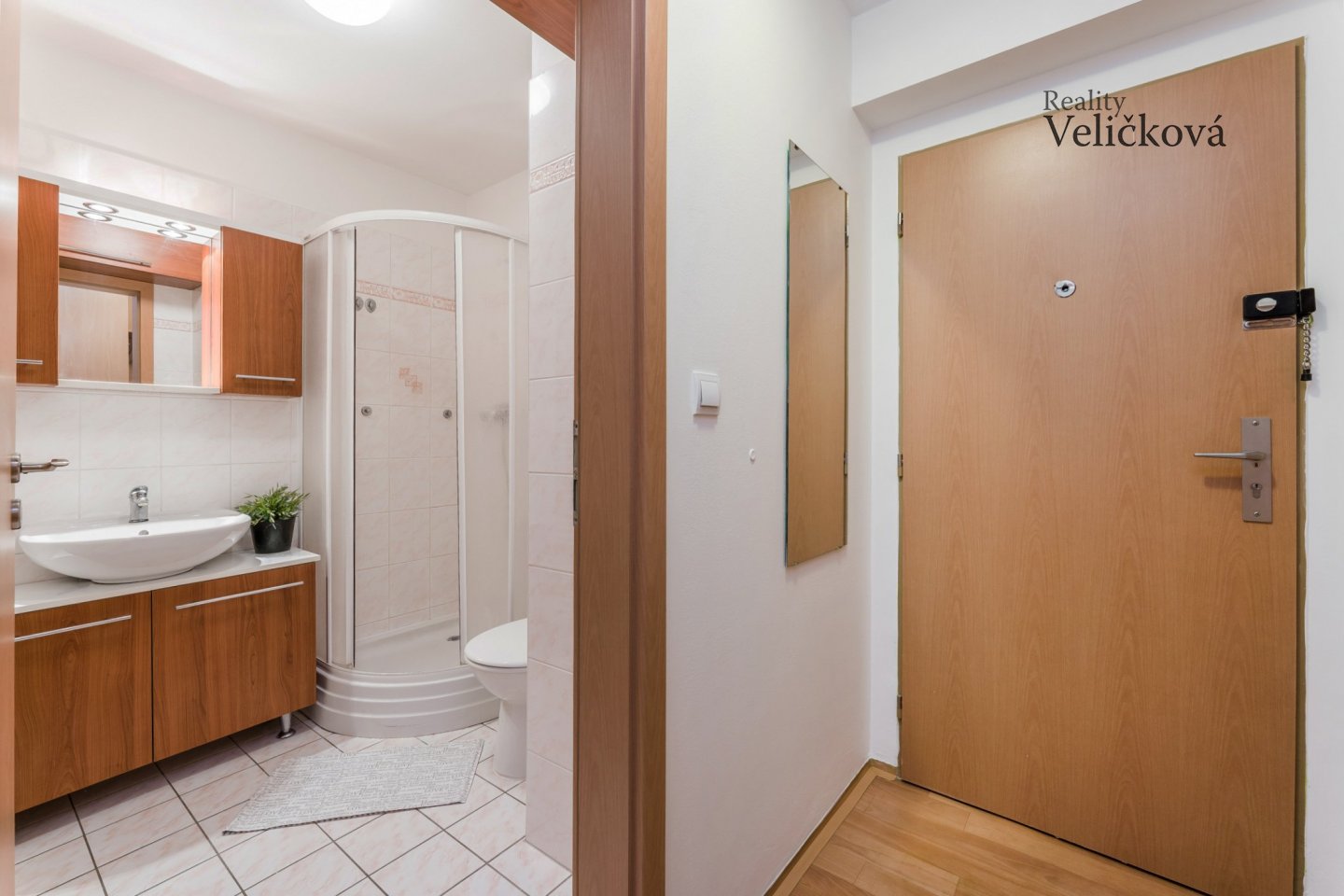 Dispozice : Vstupní chodba s vestavěnou skříní, koupelna se sprchovým koutem a WC, prostorný obývací pokoj se vstupem na balkon, propojený s plně vybavenou kuchyní, ložnice s vestavěnou skříní.